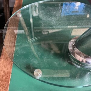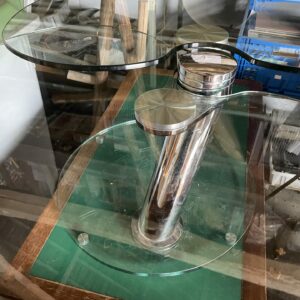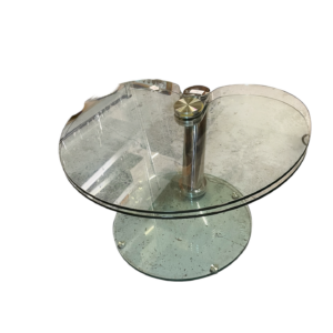 Table basse haricot en verre trempé, pieds en bois de frêne massif teinté noyer