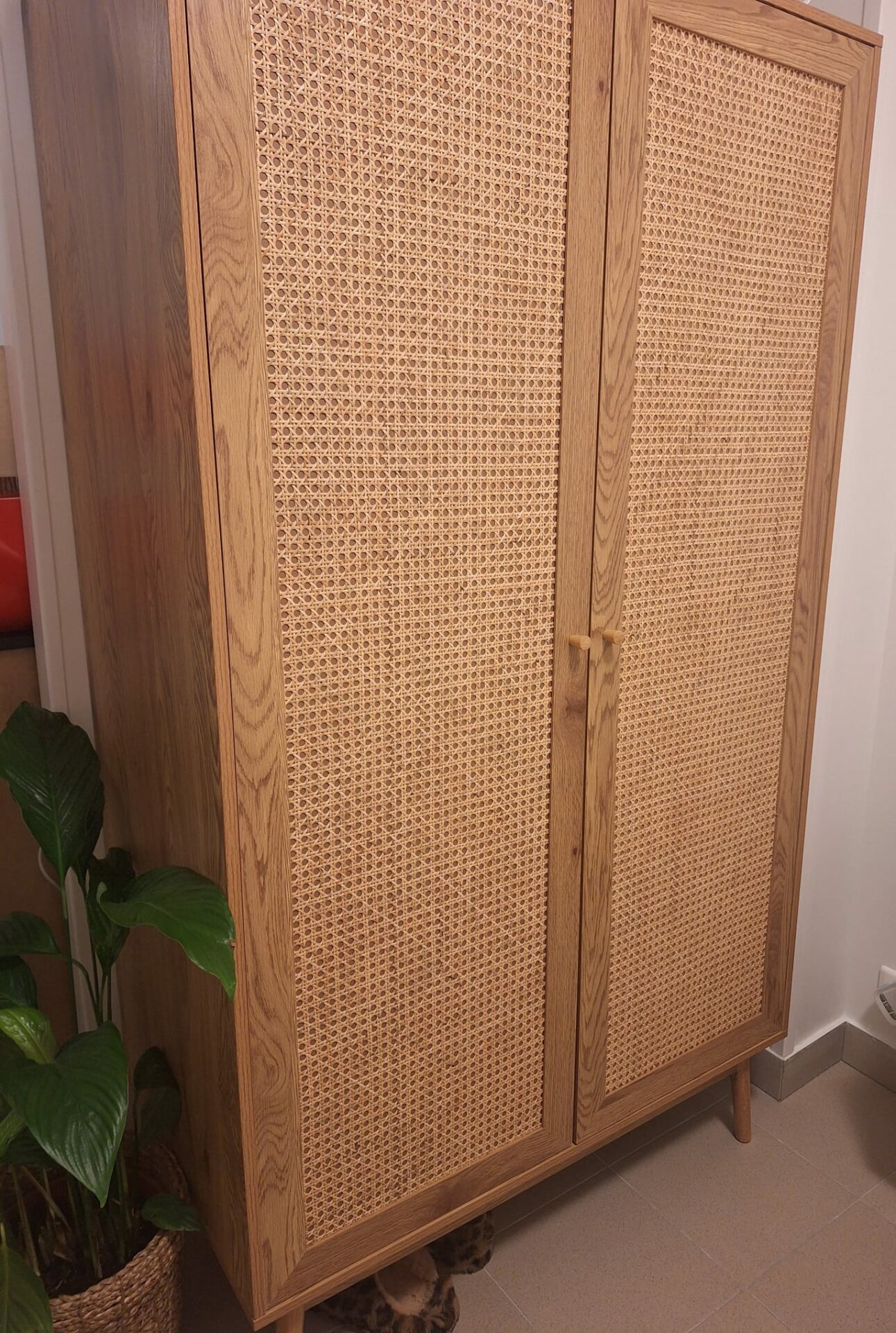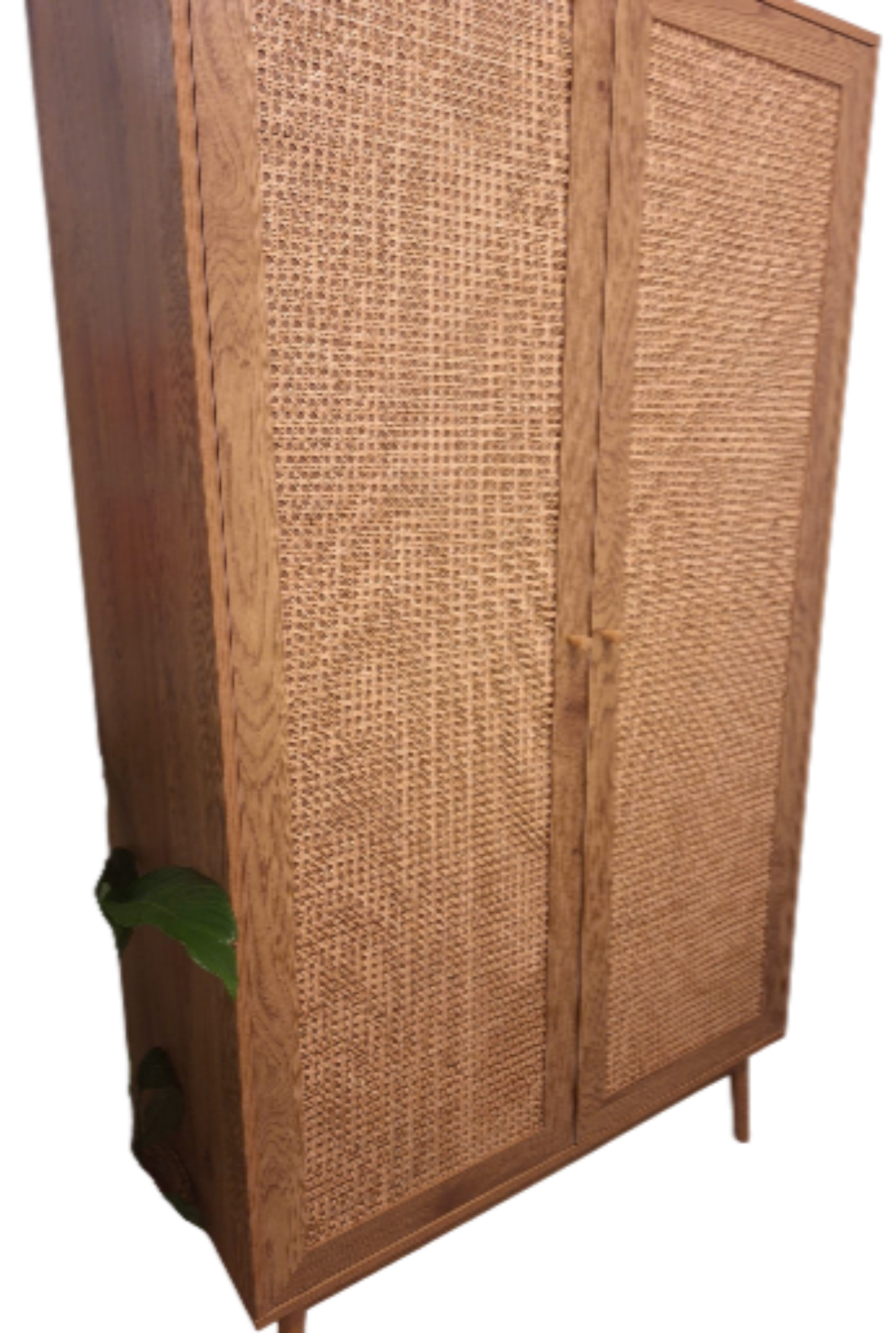 Description : Armoire avec 2 grandes portes habillées de cannage en rotin circulaire, poignées en bois massif, 4 pieds en bois massif.