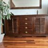 Buffet en bois massif, portes à persiennes, poignées dorées.