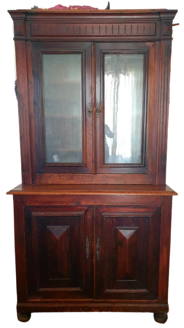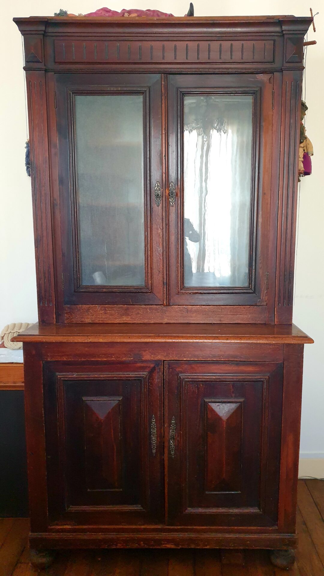 Description : Vaisselier deux corps en bois teinté et à portes vitrées.