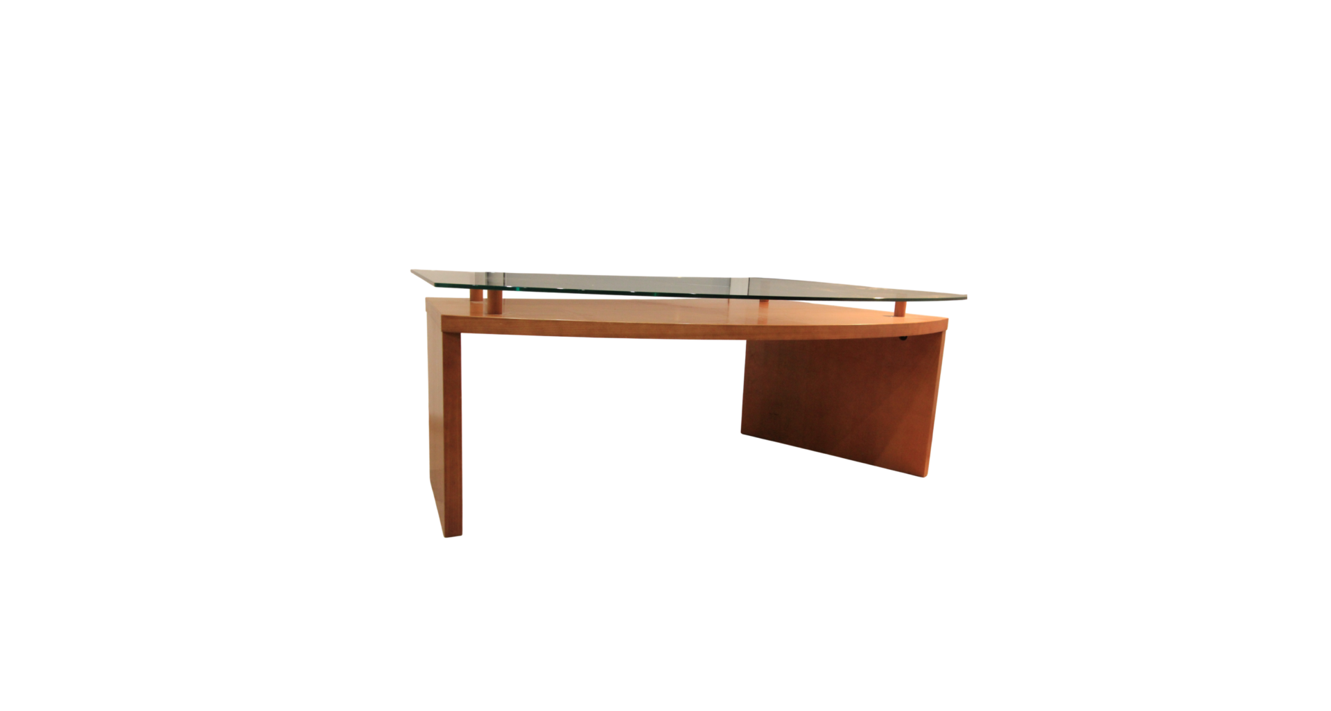 Description : Superbe bureau type art déco en bois plein, couleur claire dorée. Forme originale arrondie avec élégant plateau de verre sur pilotis. Idéal pour professionnels recevant clientèle.