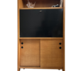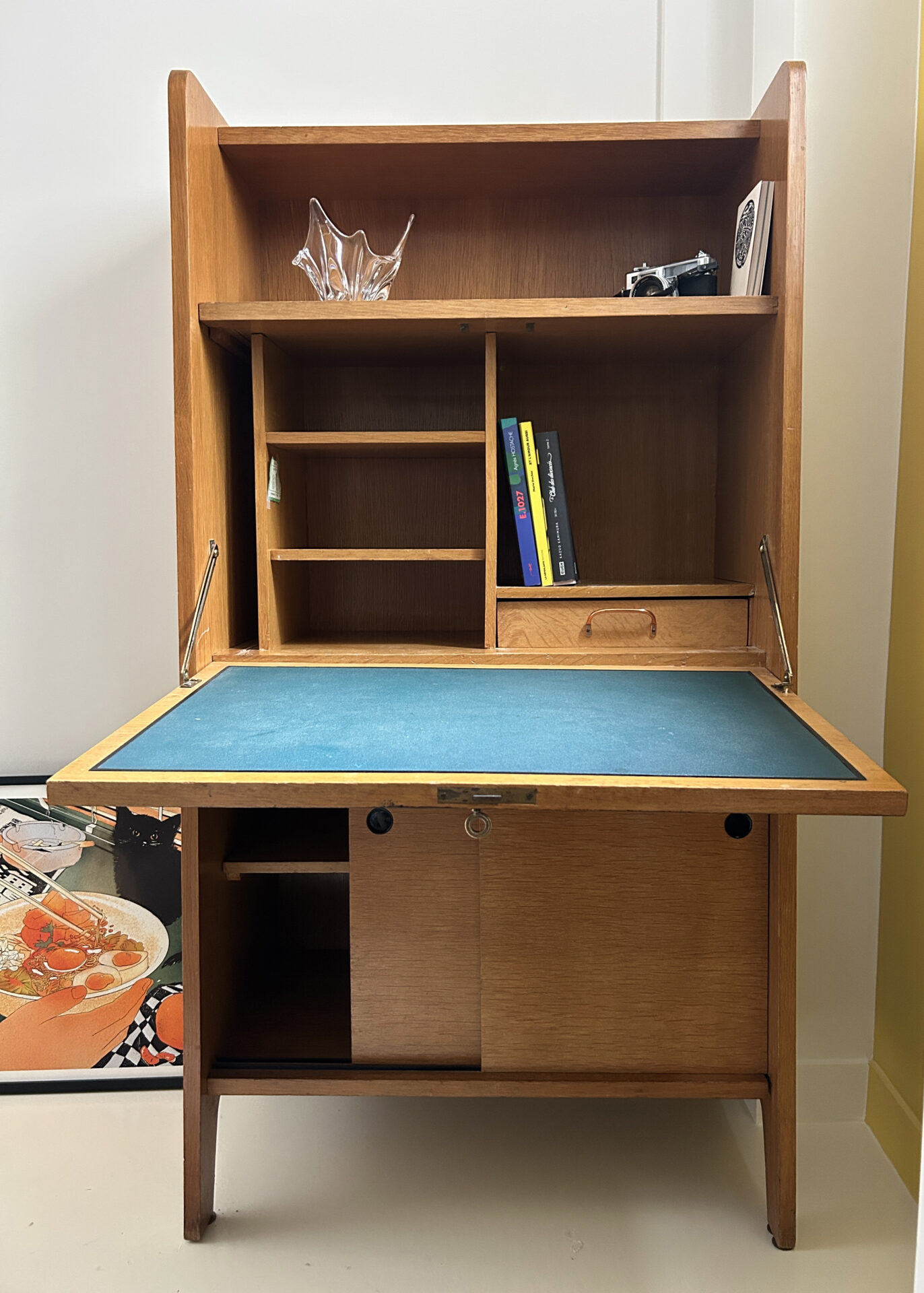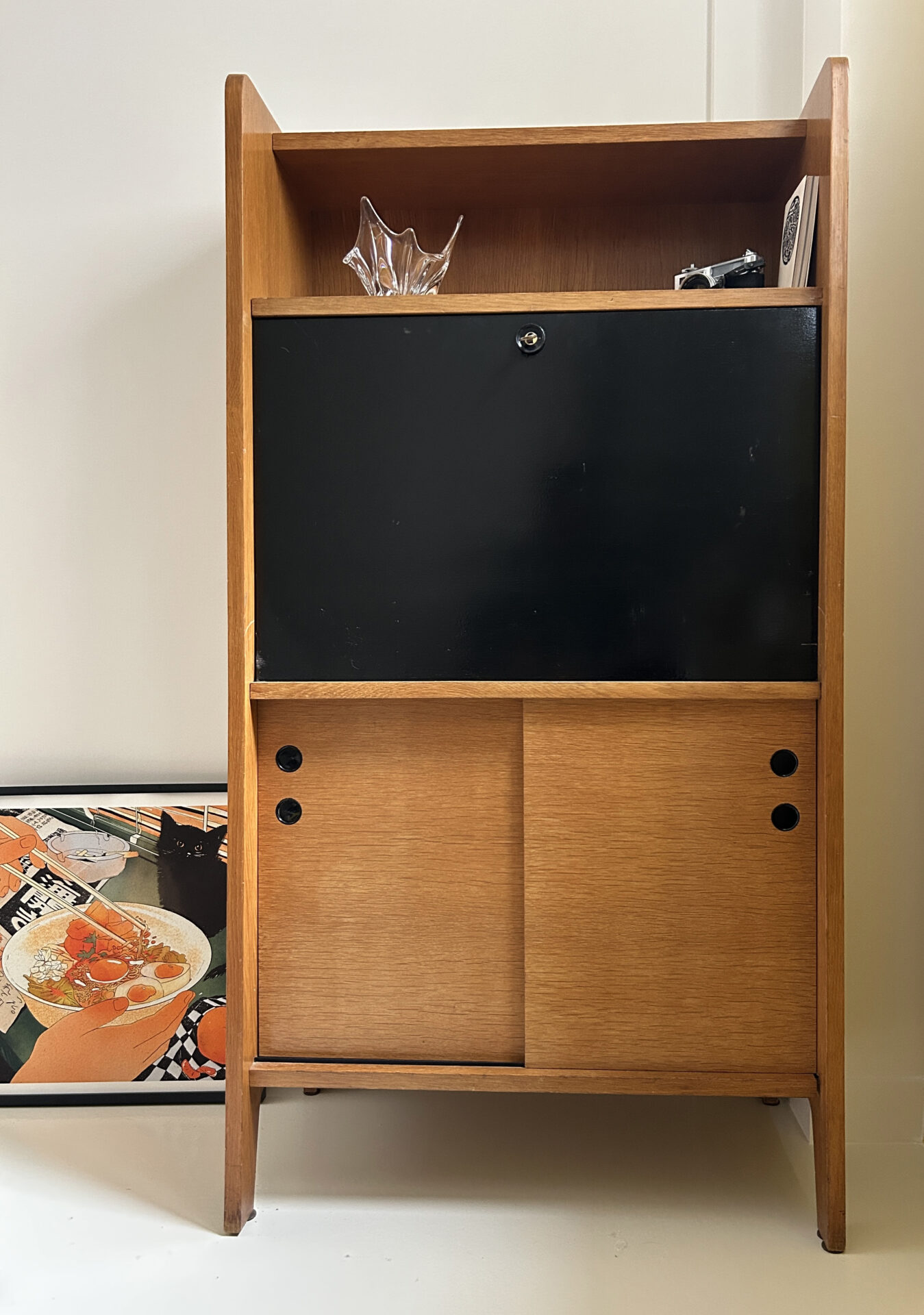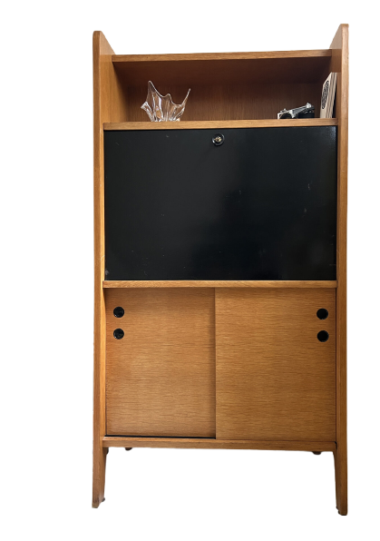 Description : Bureau secrétaire vintage en bois inspiré du design scandinave des années 60/70. Compact et fonctionnel avec un plateau abattant, plusieurs rangements intérieurs et une ligne épurée. Très bon état général avec une discrète tache sur une étagère intérieure.