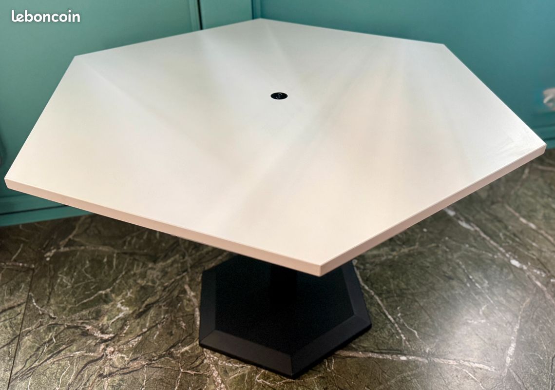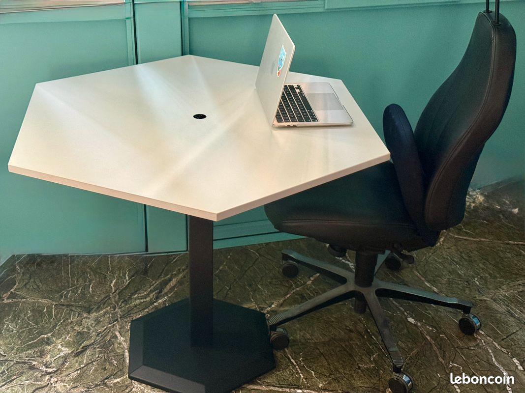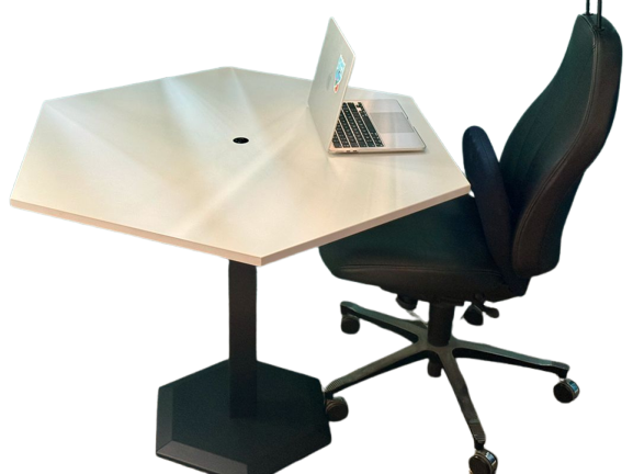 Description : Modele Honeycomb (forme en nid d’abeille) de la marque BAKKER. Bureau électrique plateau à 6 côtés ! Peut servir de bureau partagé en position haute. Prise chargeur inclue. Piétement noir en acier équipé de patins.