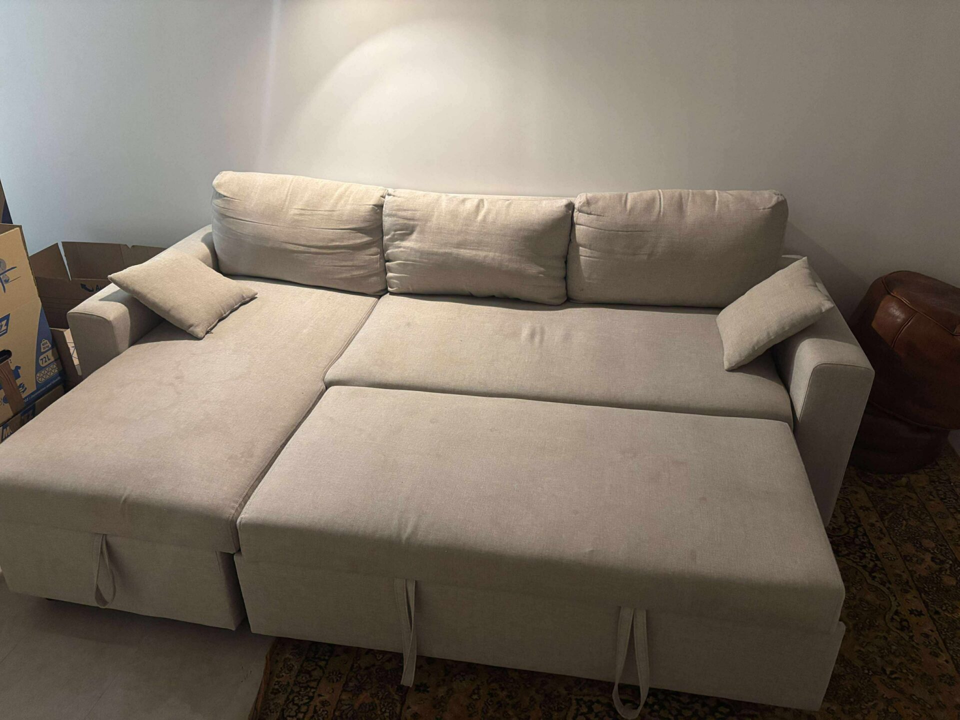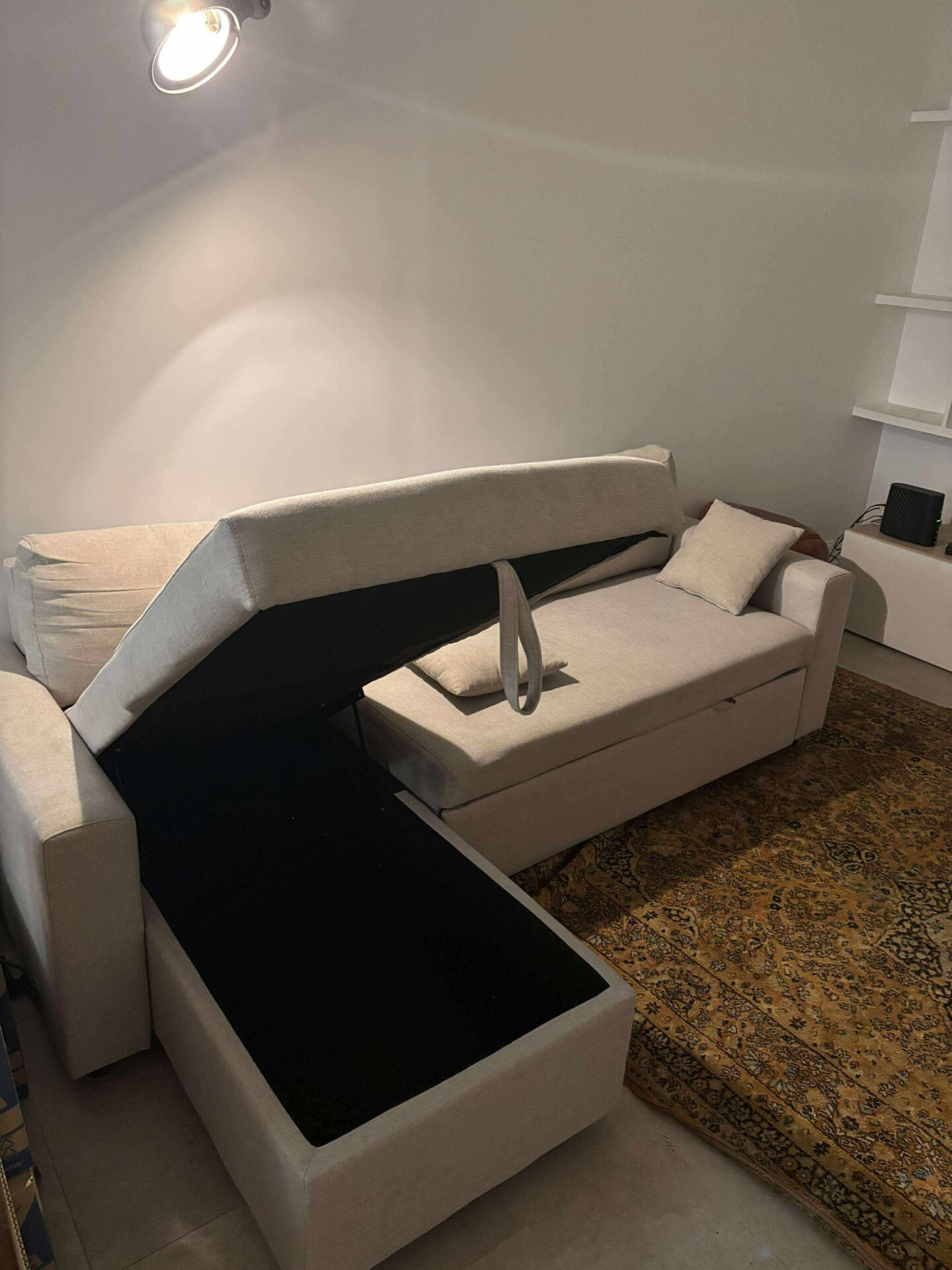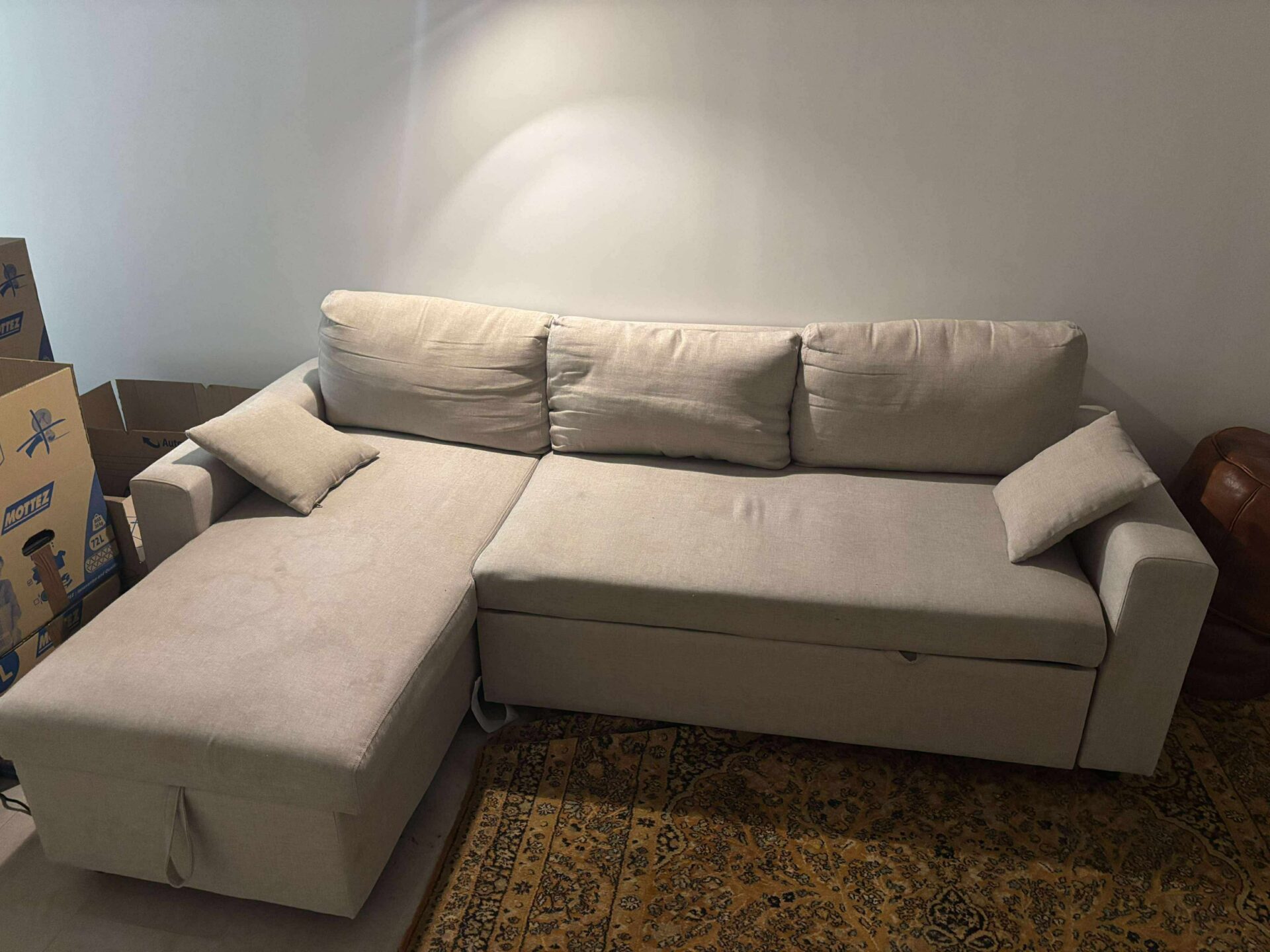 Description : Un canapé 3 places convertible en lit 2 places avec coffre de rangement. En excellent état. Quelques taches. Acheté neuf il y a 1 an et demi.