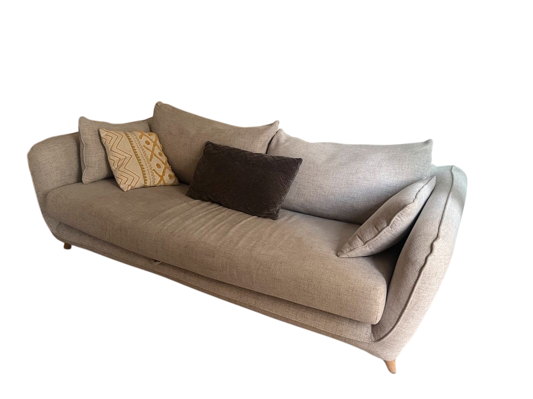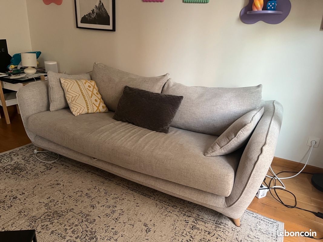 Canapé gris livré prêt à monter. Coussins d’appoint inclus.