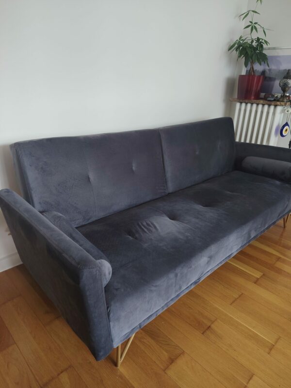 Description : Canapé convertible en velours gris de la marque SKLUM. En très bon état. Comprend 2 petits coussins accoudoirs. Le dossier a 2 hauteurs réglables, et peut s’abaisser entièrement pour le transformer en canapé convertible.