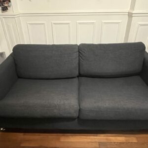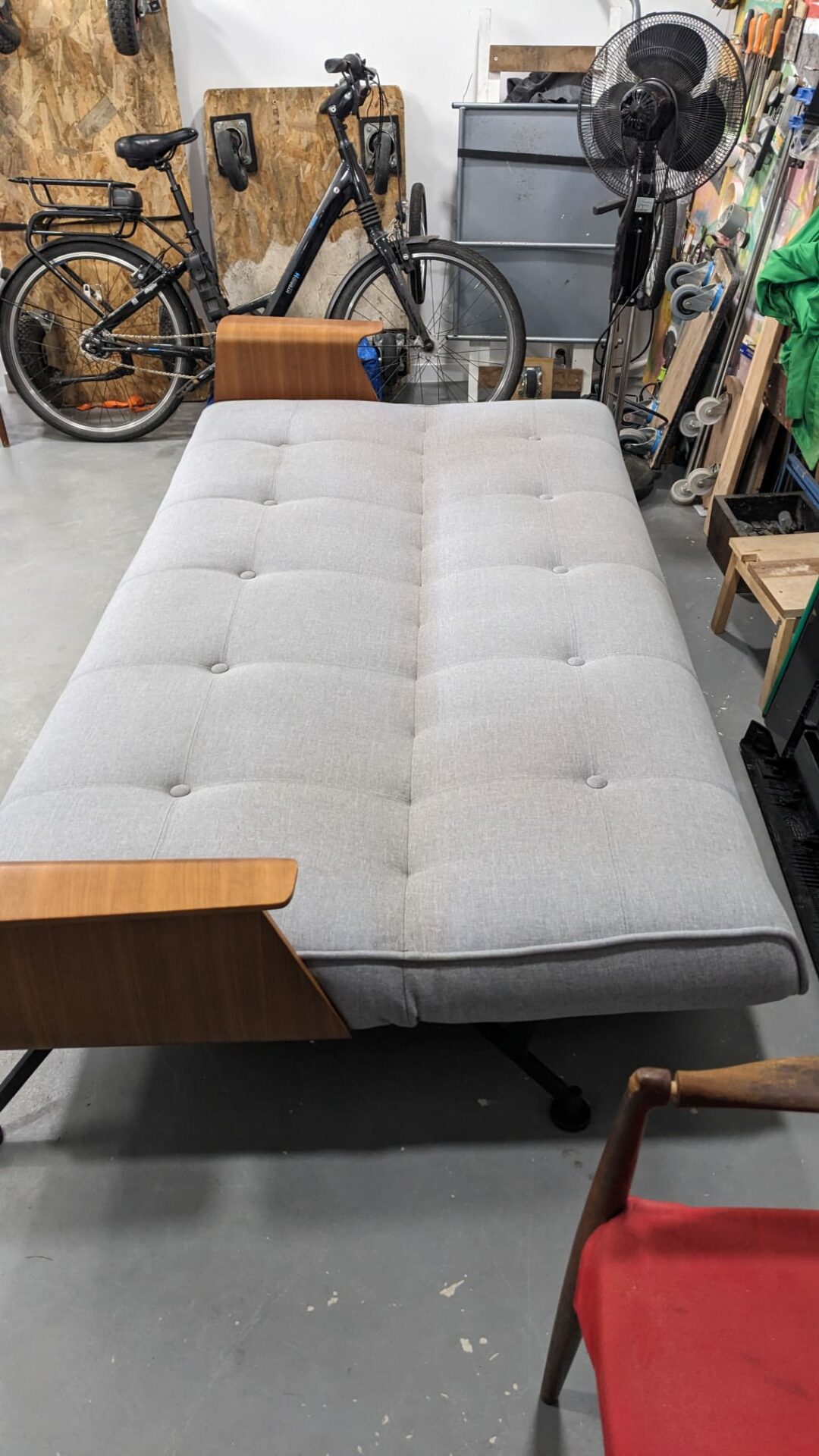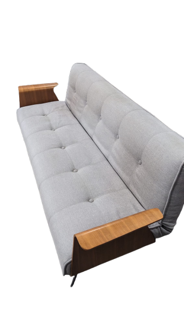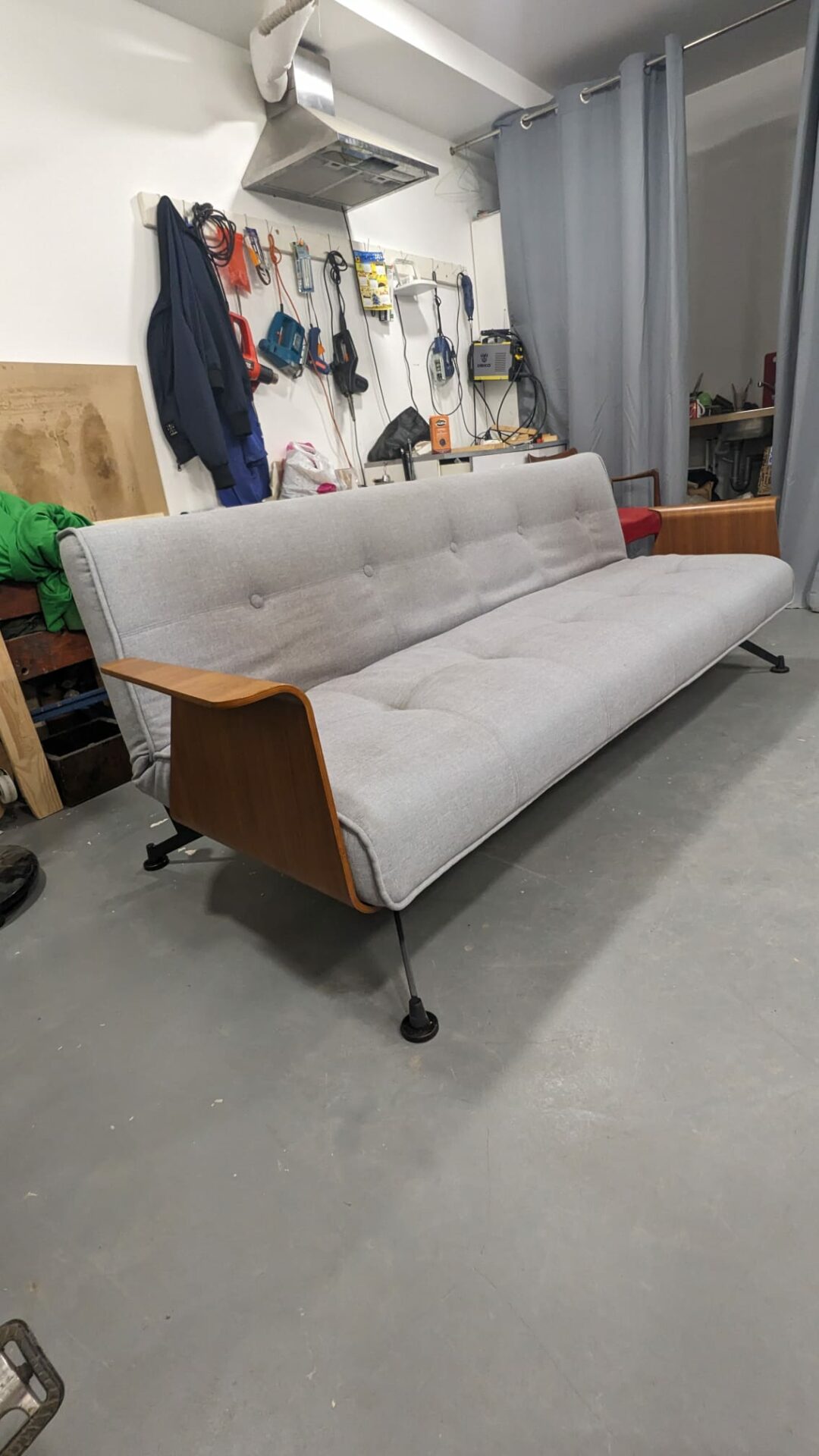 Description : Canapé convertible Habitat style vintage en tissus coloris gris avec accoudoirs en bois. Bon état, un ressort défectueux.