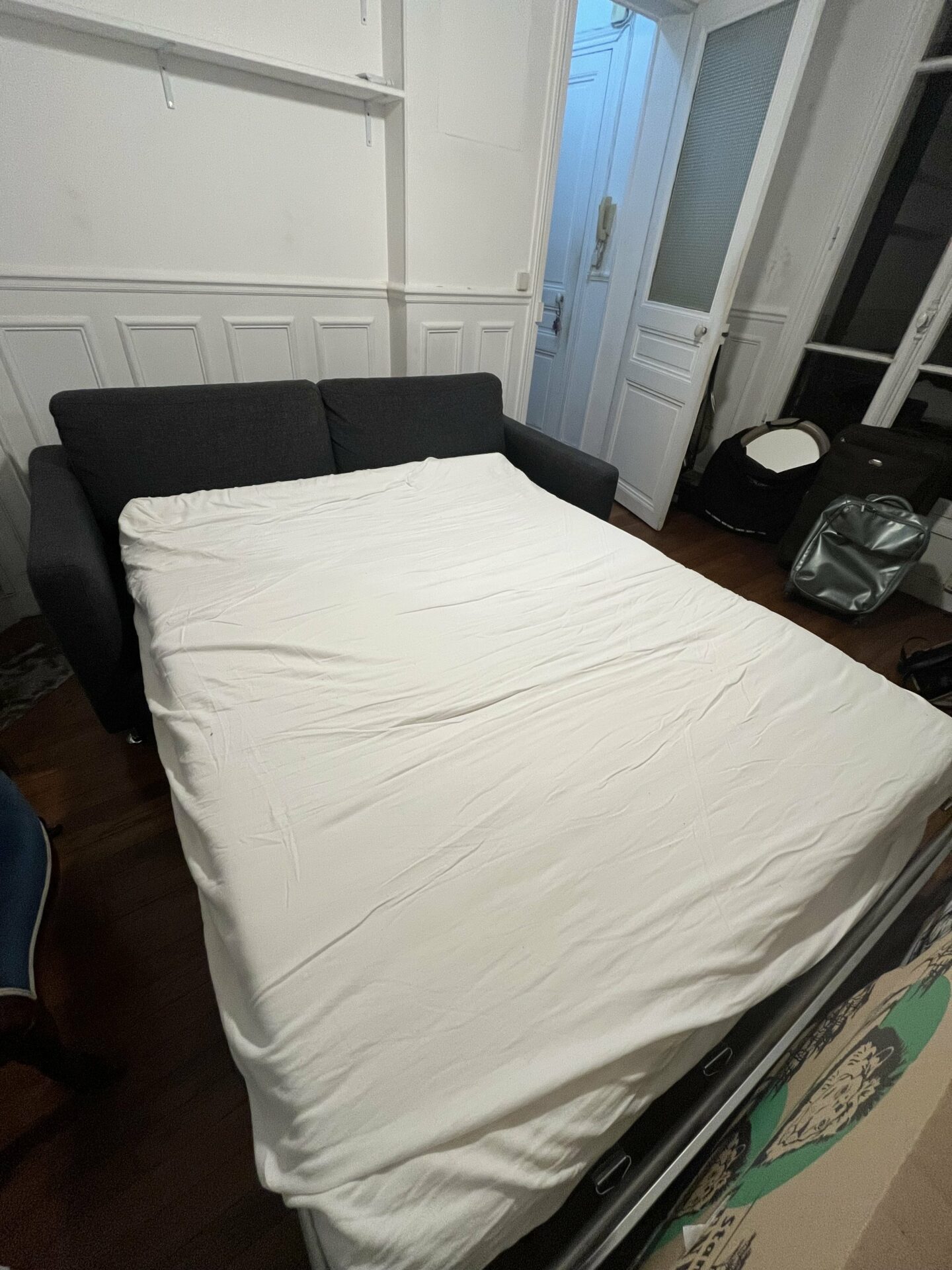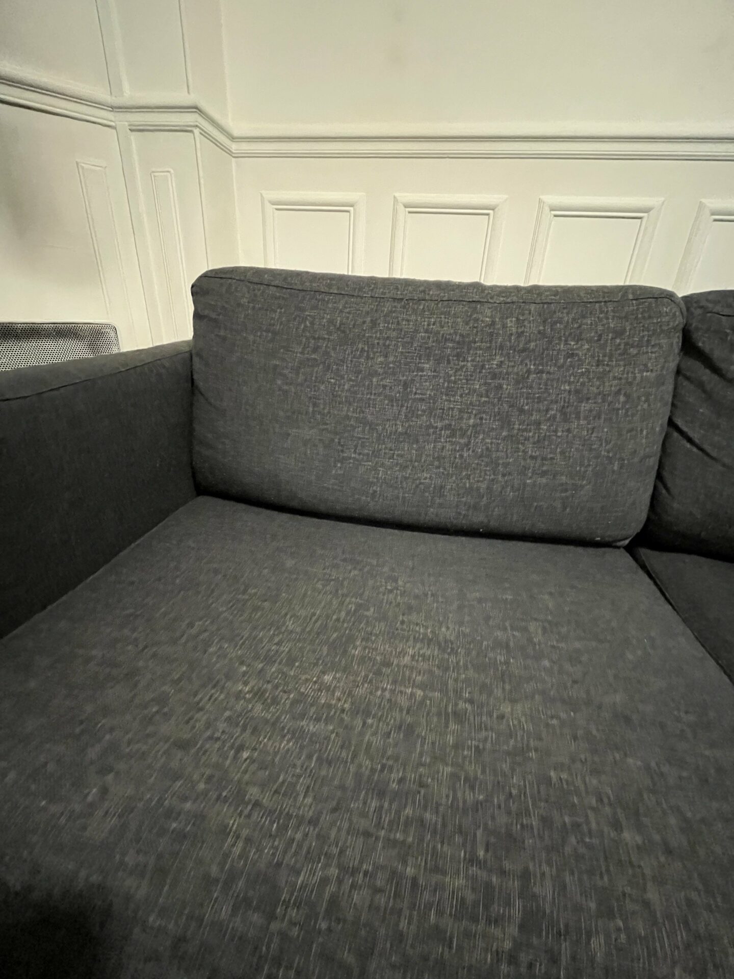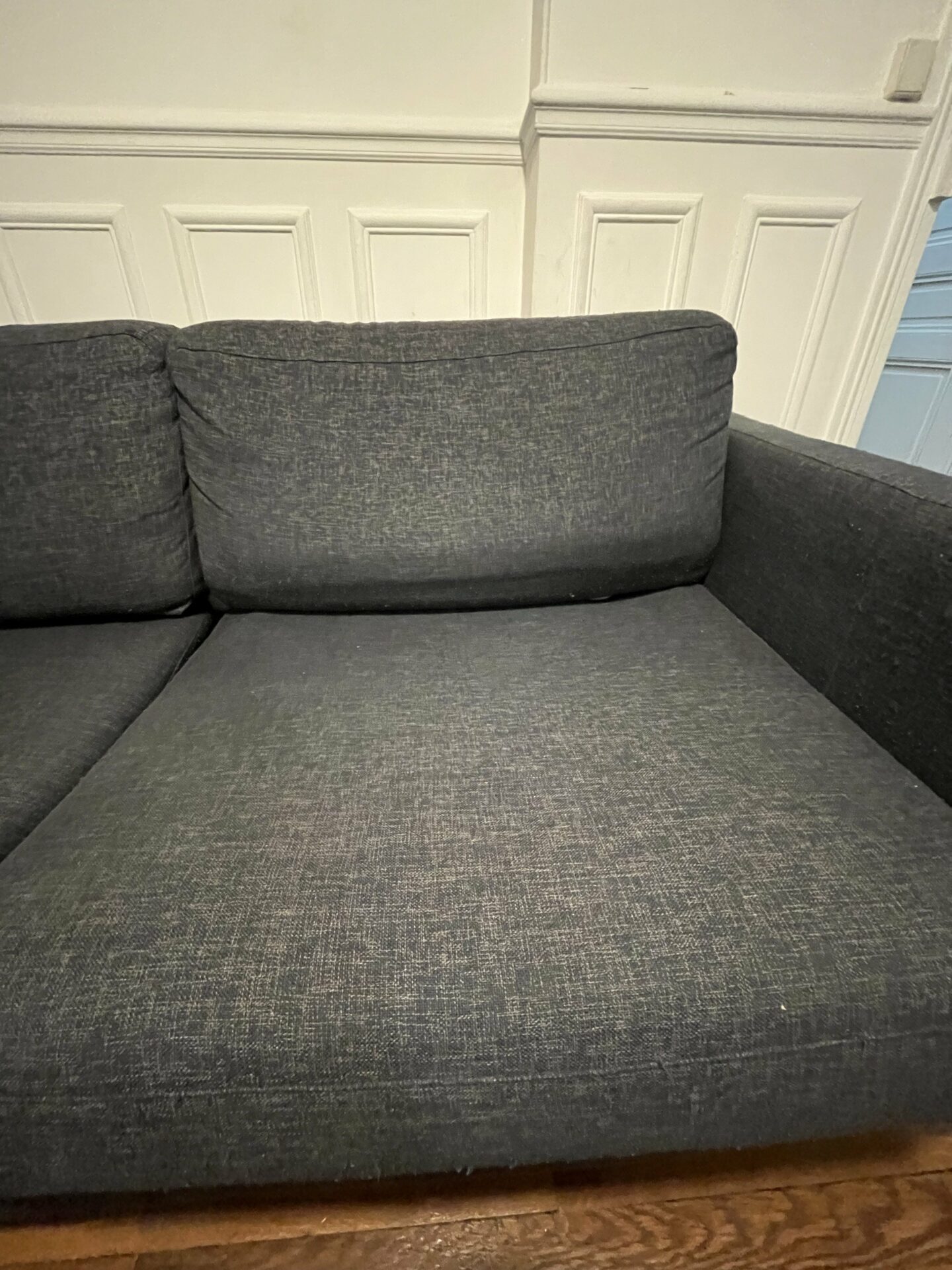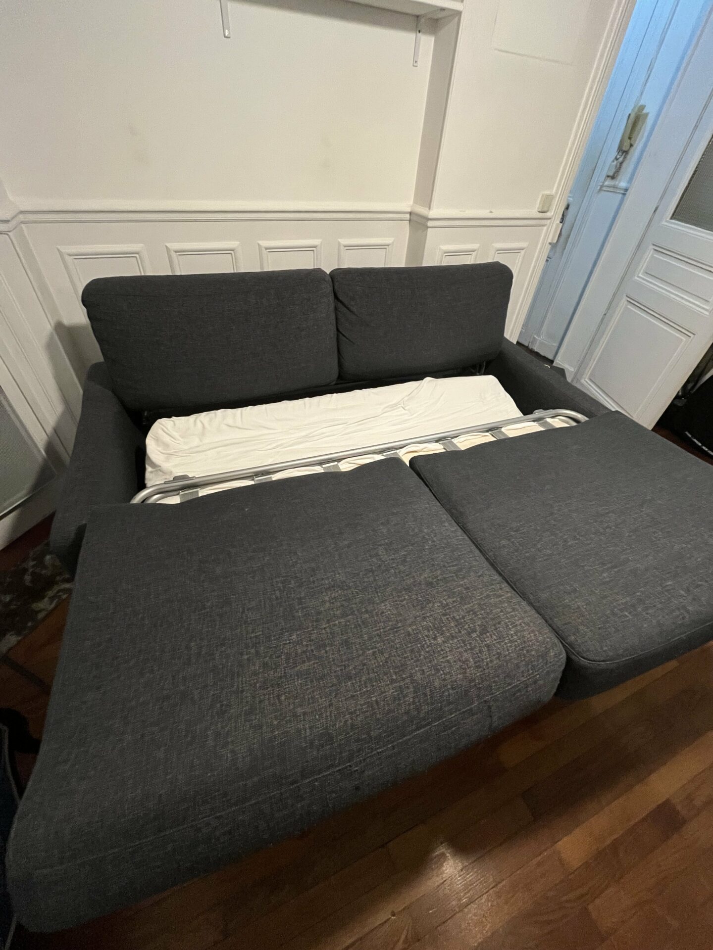 Description : Canapé 3 places convertible de couleur bleu gris foncé, en parfait état ! Tissu extérieur : pas de taches, ni de trou. Ni d’usure, simplement des « bouloches » qui peuvent facilement être retirées avec un appareil adapté. Idem pour le matelas, il a servi occasionnellement.