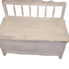 Vente d’un coffre enfant en bois à barreaux, repeint en blanc lazuré, intérieur tapissé d’un revêtement type papier peint plastifié lavable.