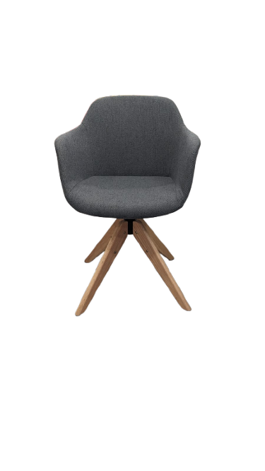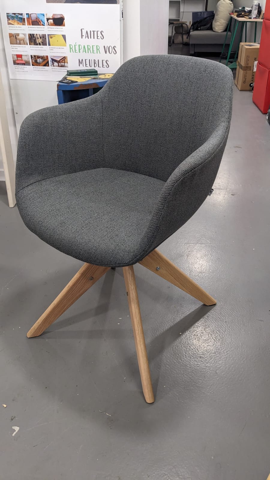 Description : Chaise de bureau confortable en tissu avec revêtement gris restanque et piètement en bois élégant.