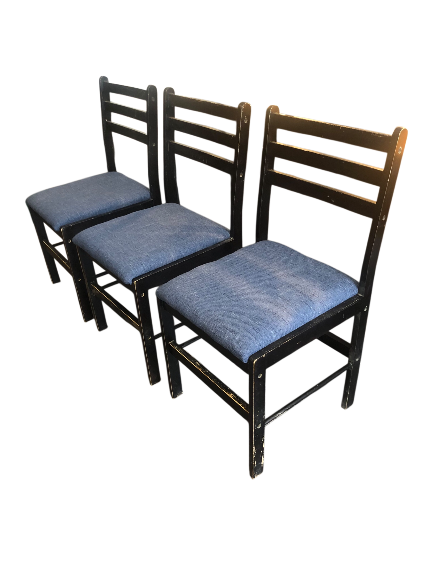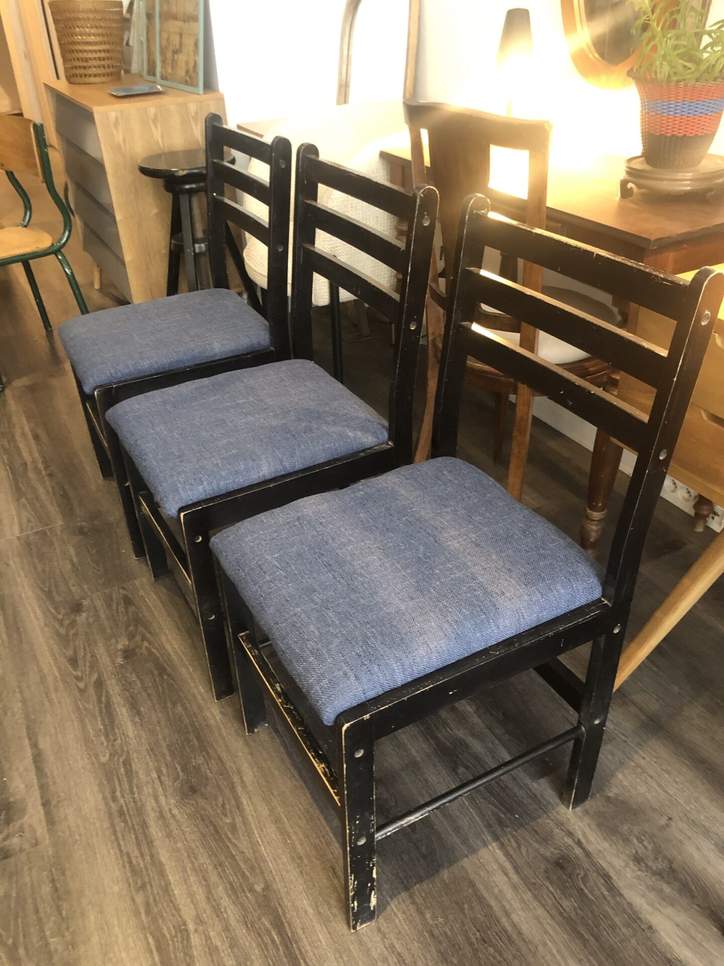 3 chaises en bois noir Assises refaites tissu bleu