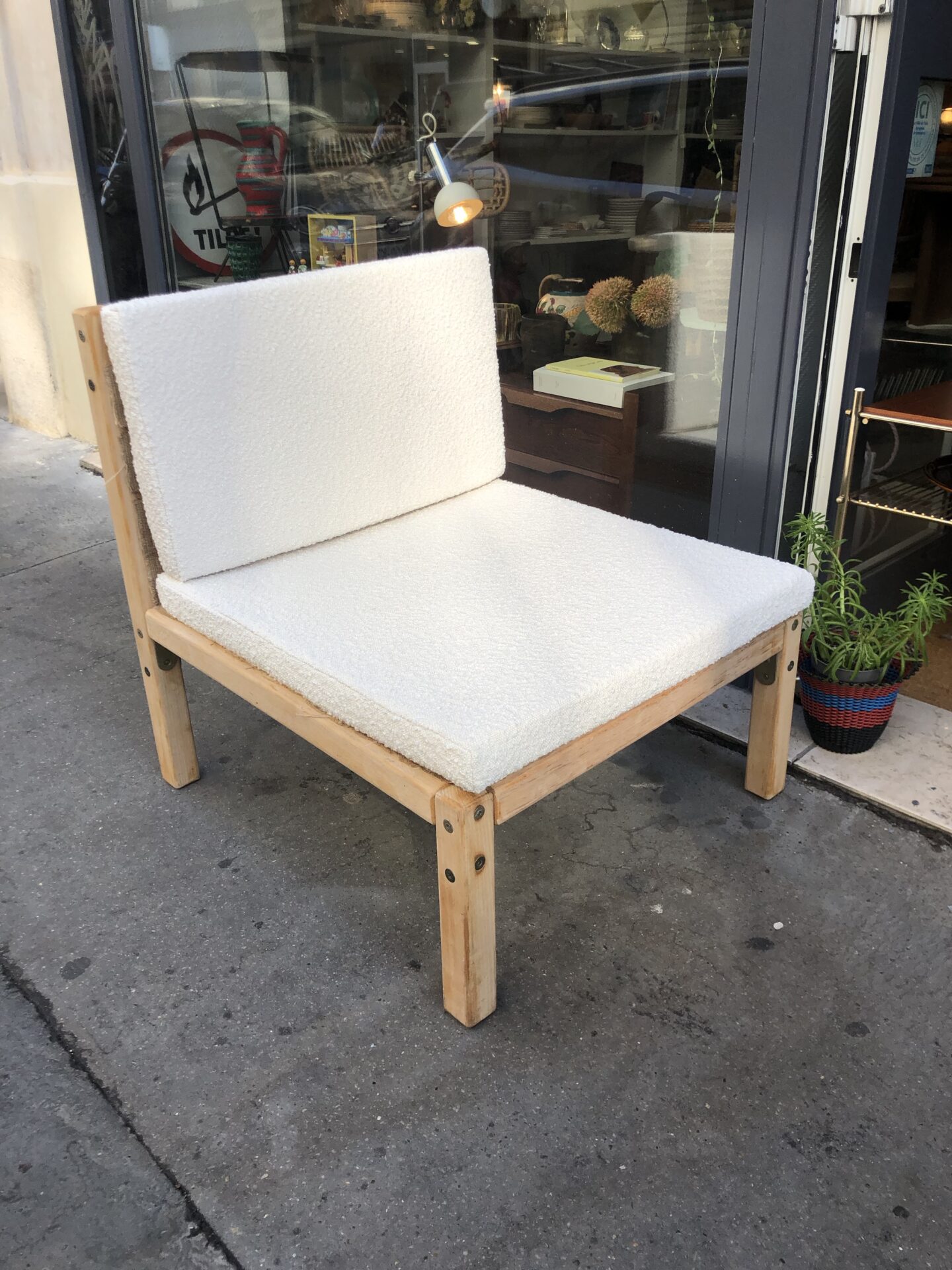 Sa structure en bois clair et ses coussins en tissu bouclette blanc