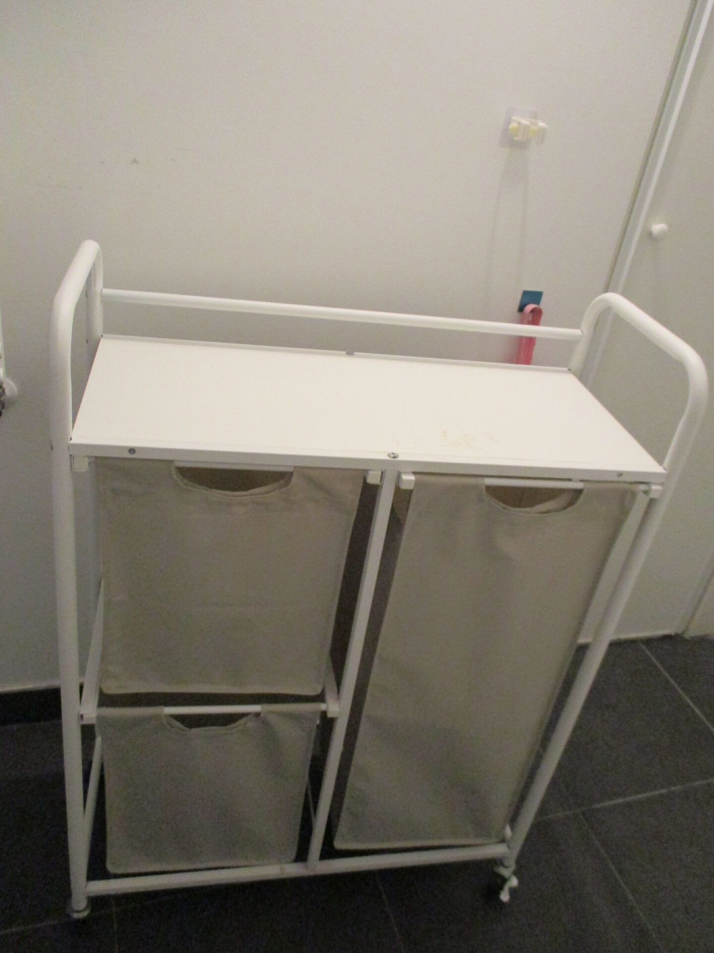 Description : Panier à linge à 3 compartiments, facile à déplacer avec des roues.
