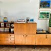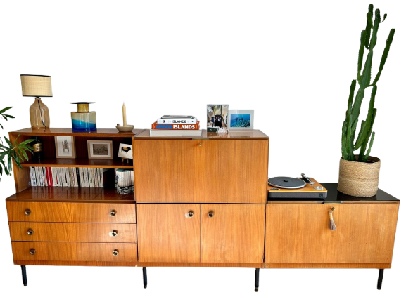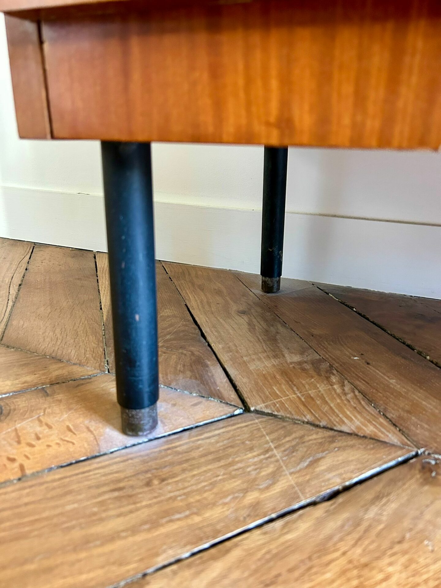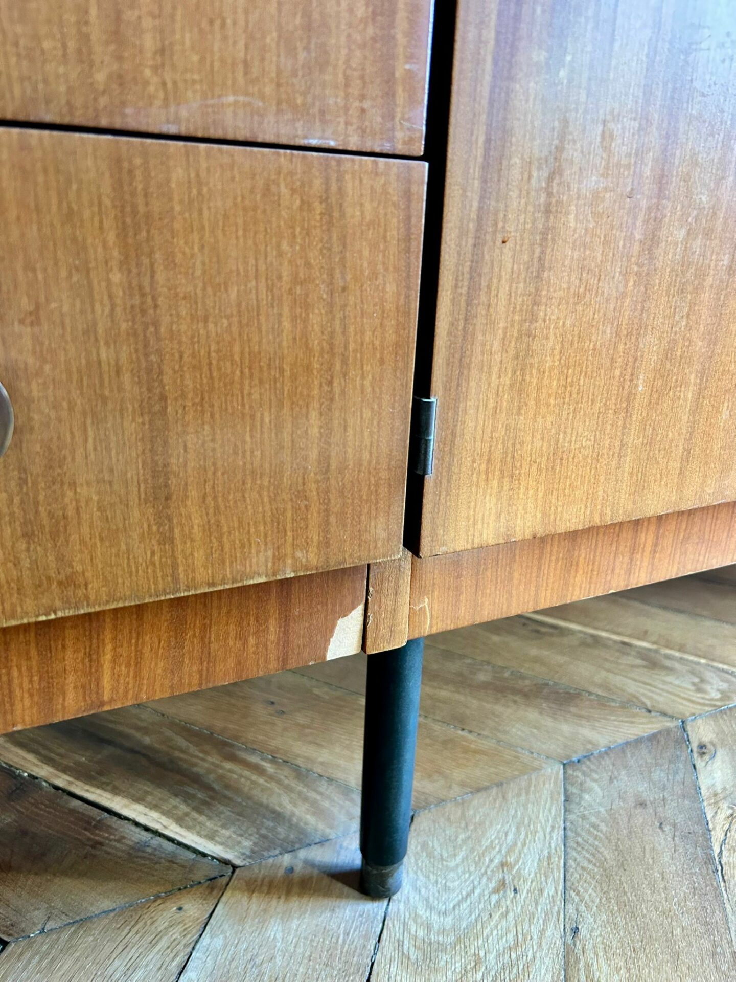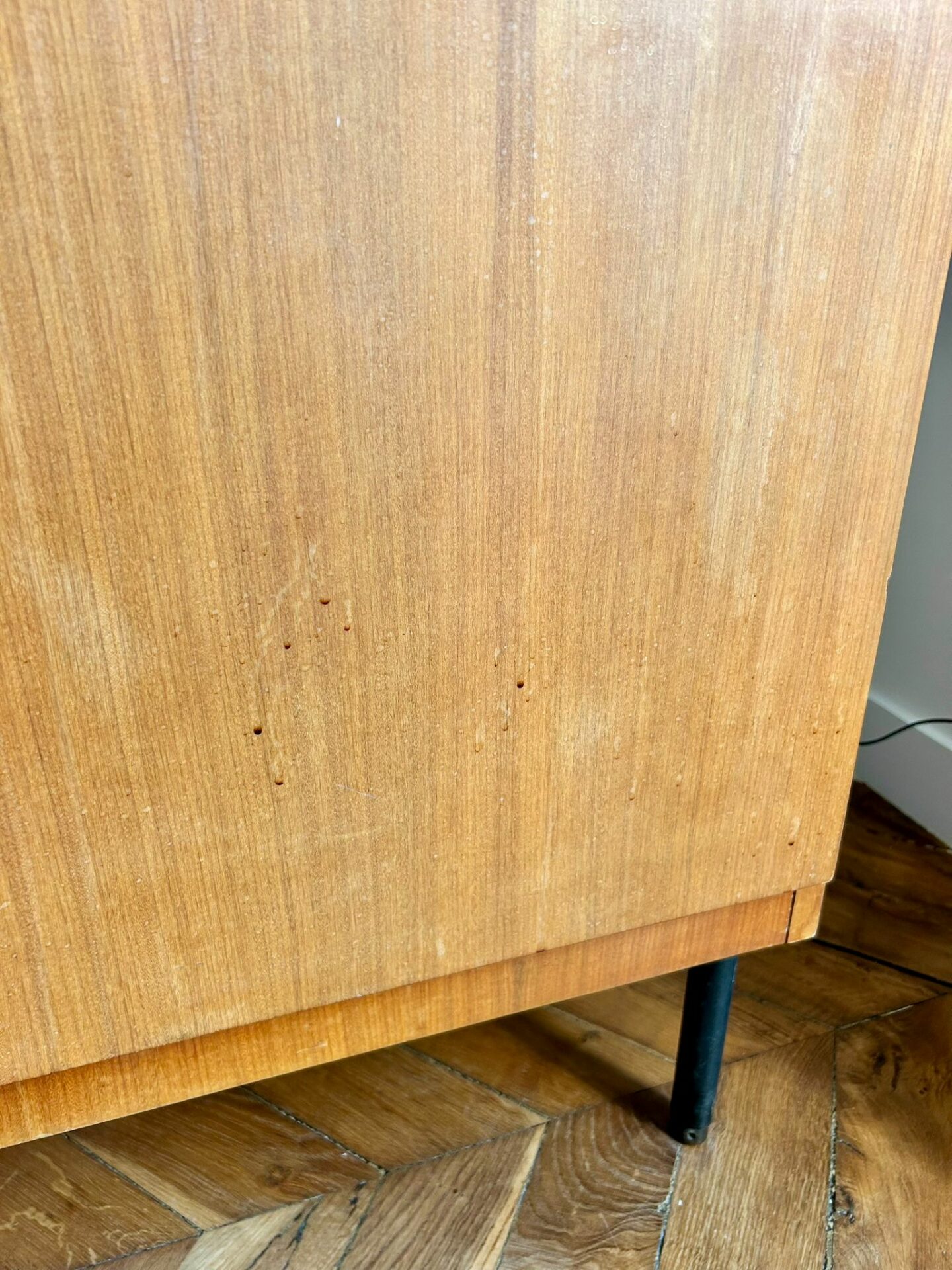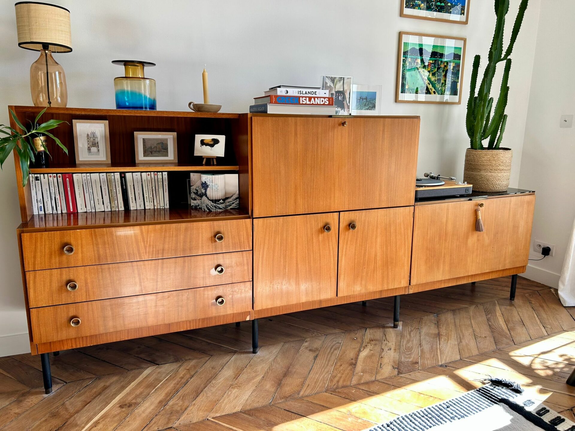 Description : Enfilade vintage Marcel Gascoin achetée aux Puces de Saint-Ouen. Plaque noire en verre posée sur la partie droite. Pieds réglables en hauteur pour assurer la stabilité et ajuster en fonction du sol. Très bon état général, quelques accrocs visibles sur les photos.