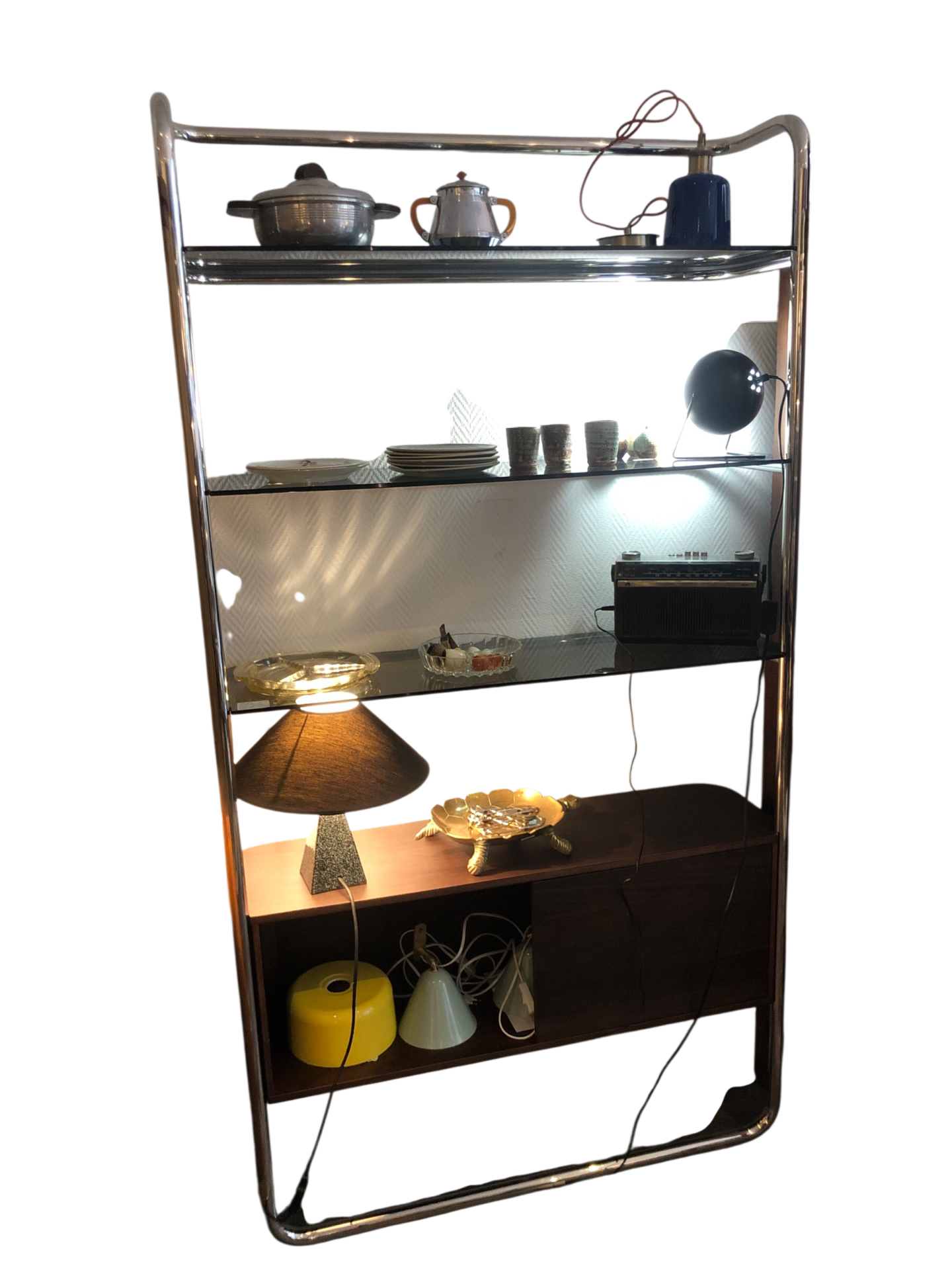 3 étagères en verre fumé et d’un caisson en placage noyer avec une porte