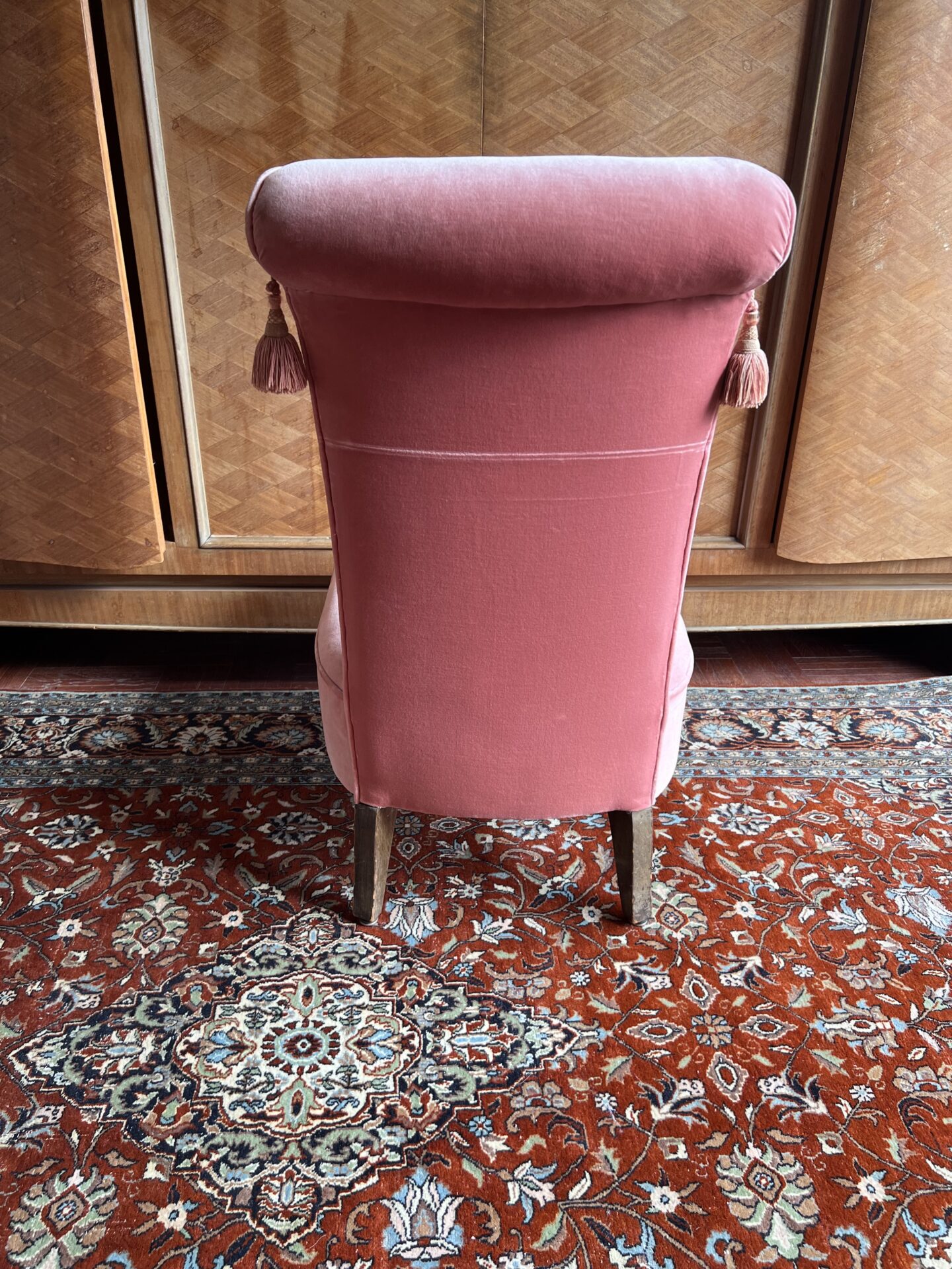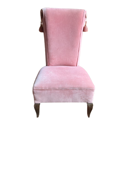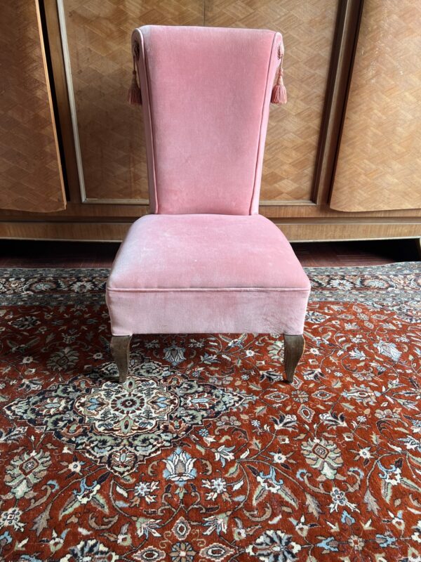 Description : Fauteuil ancien de style années 1950–1960, à dossier haut avec léger rouleau supérieur. Structure en bois, pieds galbés, assise confortable. Revêtement en velours rose pâle, d’origine avec une jolie patine. Le fauteuil est en très bon état général, stable, Idéal en fauteuil d’appoint, chambre, salon ou décor vintage.
