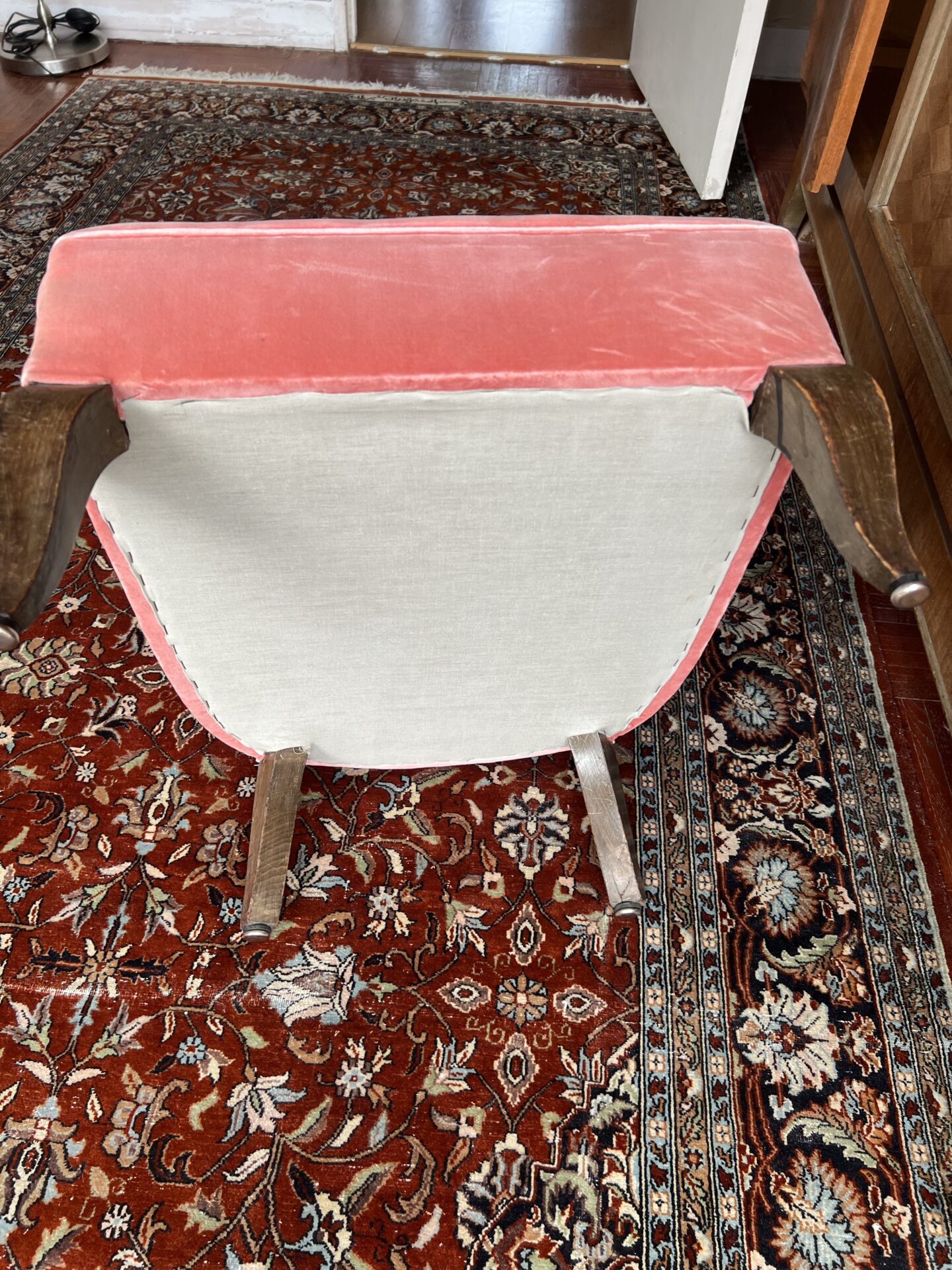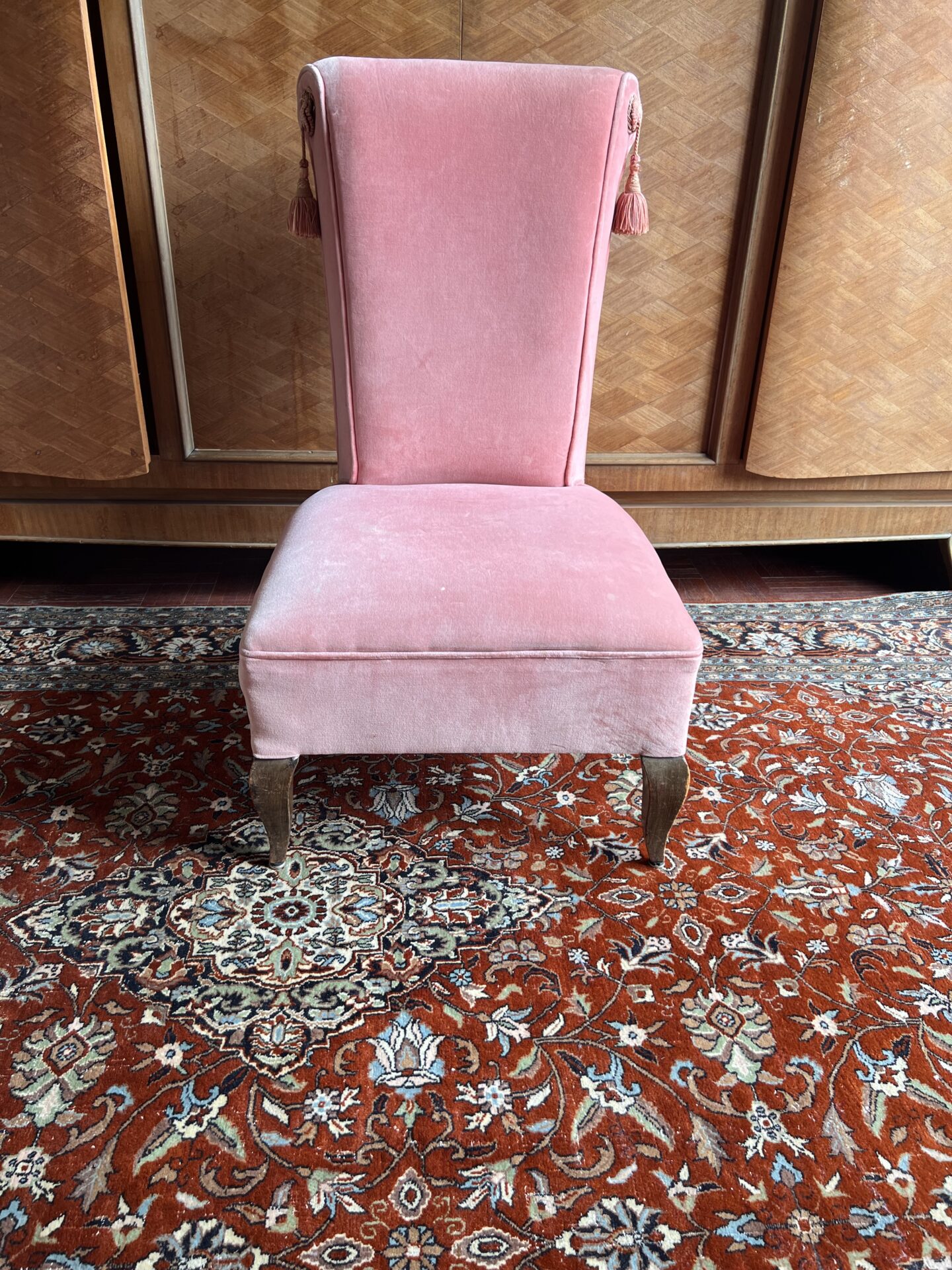 Fauteuil ancien dossier haut velours rose pale