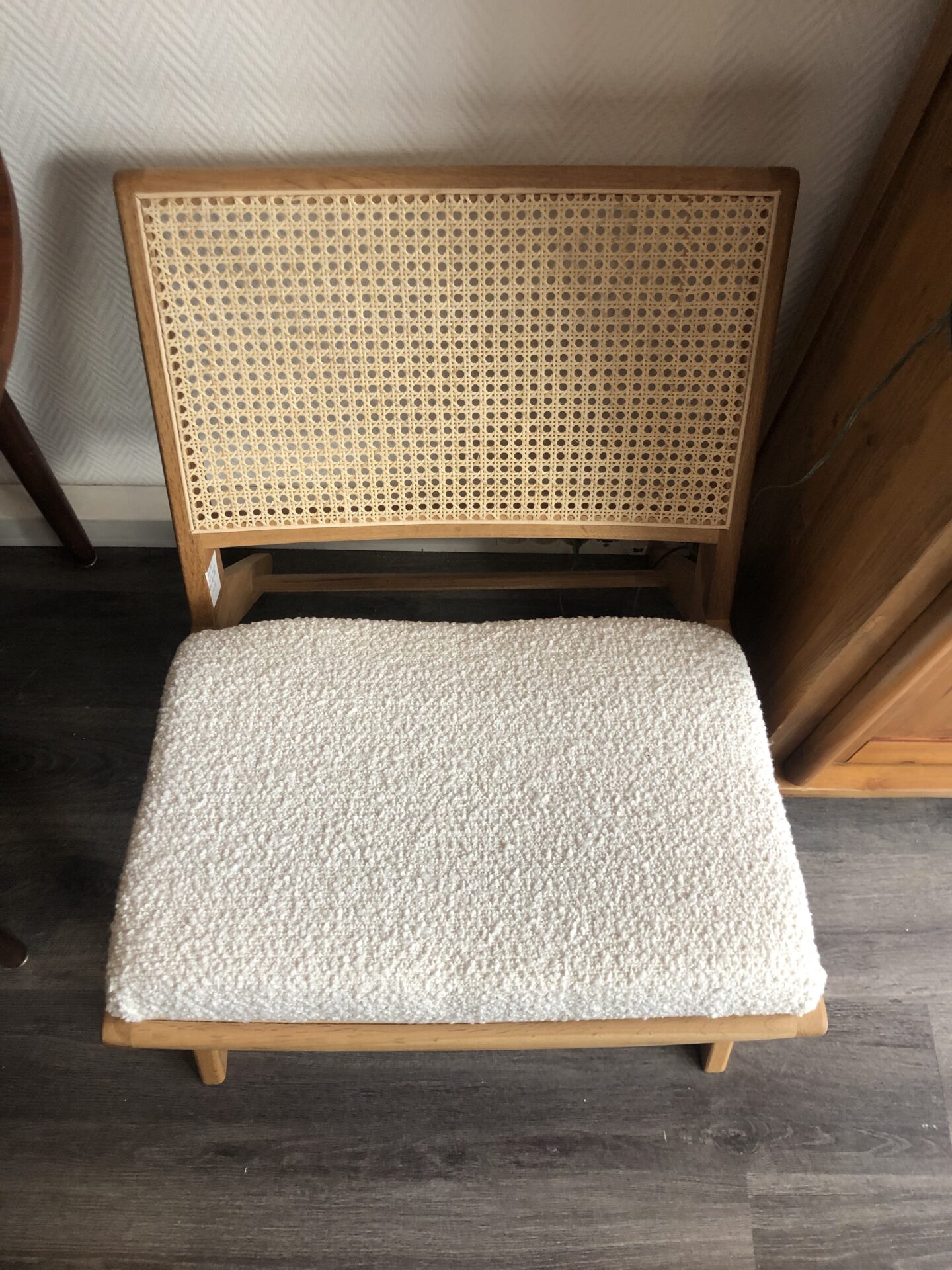 Fauteuil chene – cannage – tissu bouclette blanc