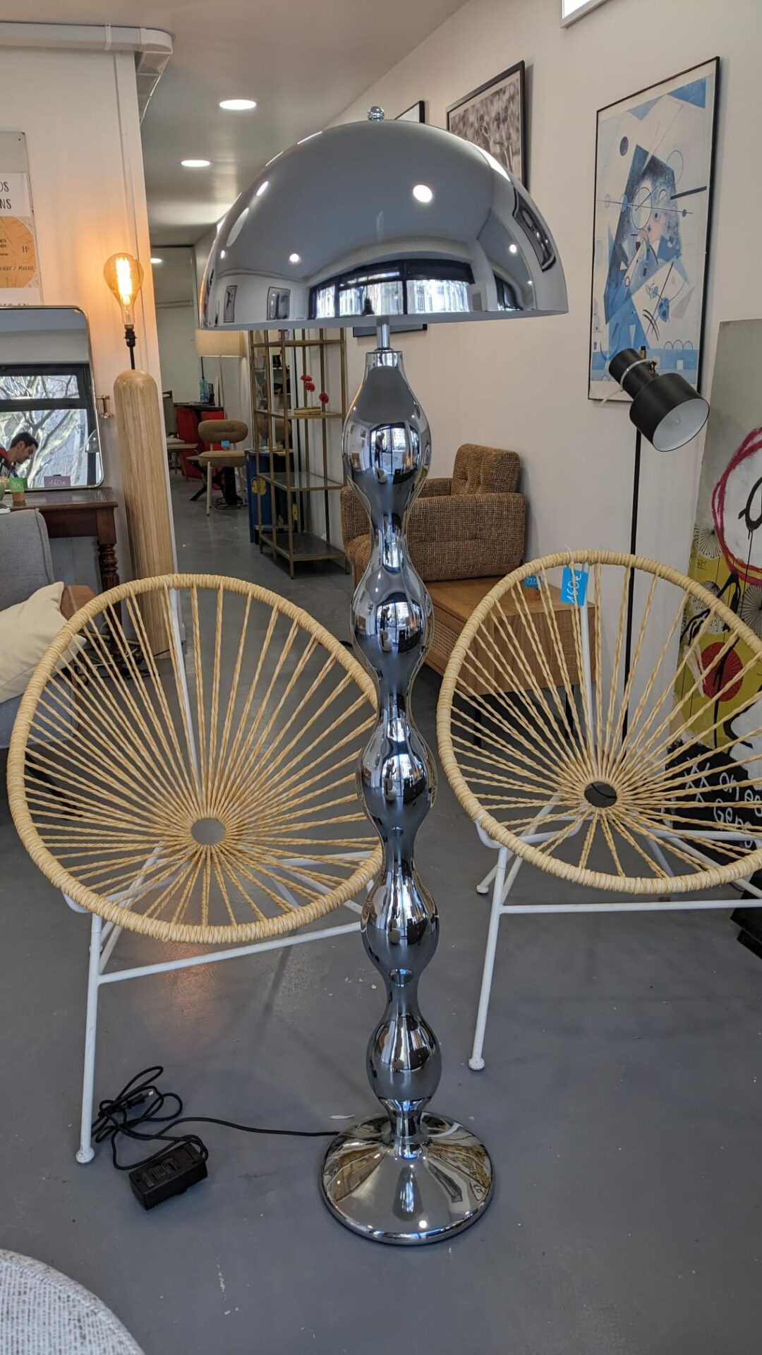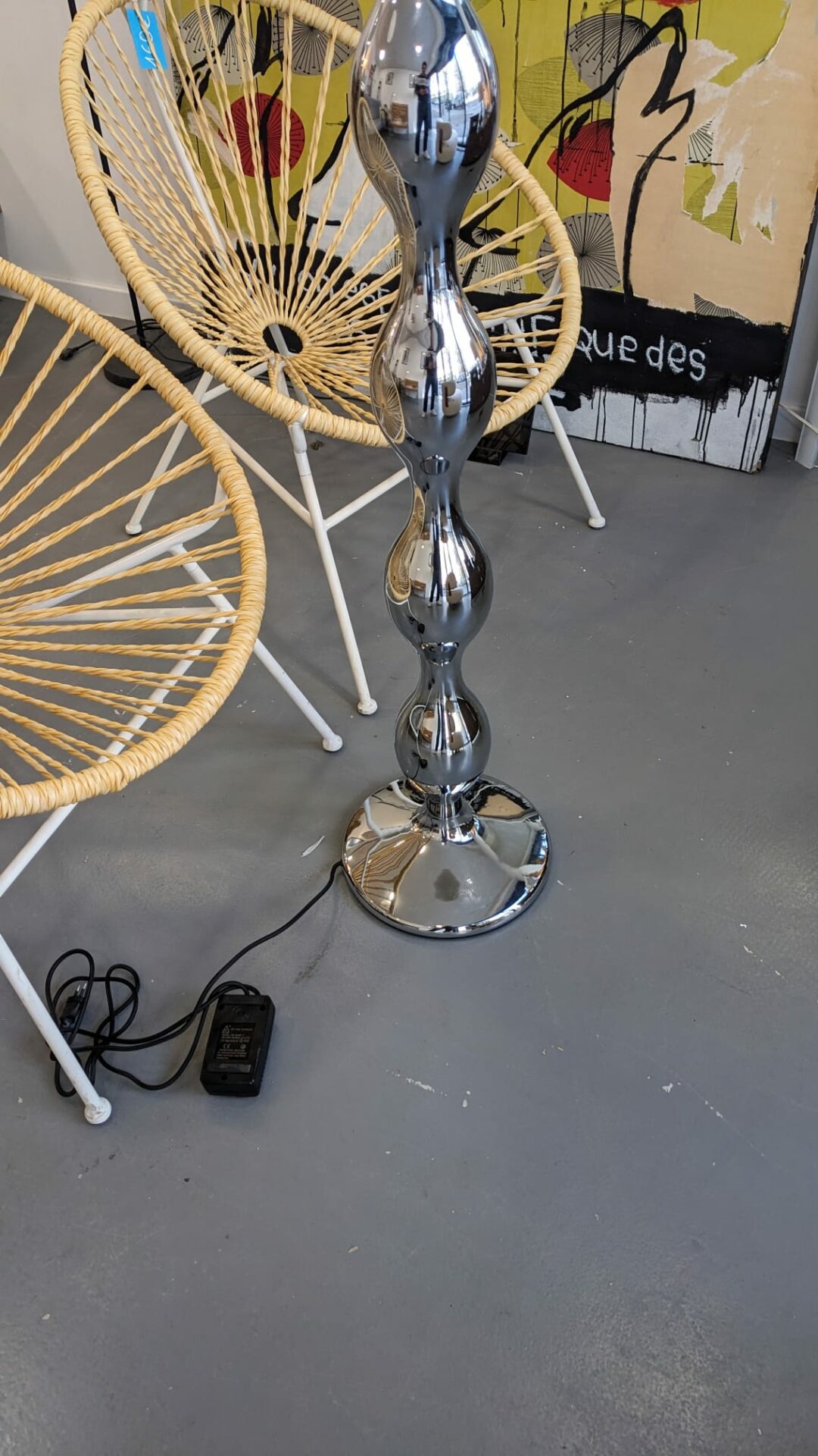 Description : Lampadaire, Chromé, finition miroir. S’inspire des luminaires de type bobine, devenus cultes en décoration pour leur fluidité et leur esthétique unique. Sa conception en polyrésine moulée, travaillée dans une teinte naturelle satinée, lui confère une allure raffinée et intemporelle.