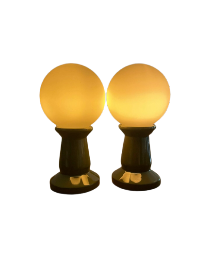 Description : 2 lampes signées Jean Pierre Garrault pour Prisunic Monoprix édition 2023. Coloris kaki. Dolomite et verre.