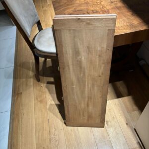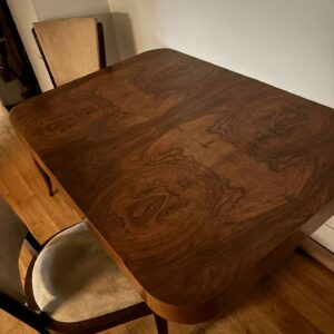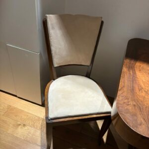 Description : Chaises bois et placage bois. Assise en tissu beige. Bon état mais le tissu peut être un peu tâché ou défraîchi. Il peut se nettoyer ou se changer assez facilement. Ces chaises sont assorties à la table carrée avec rallonge.