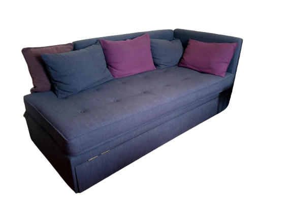 Description : Convertible en lit 2 places, en tissu bleu-gris.