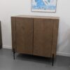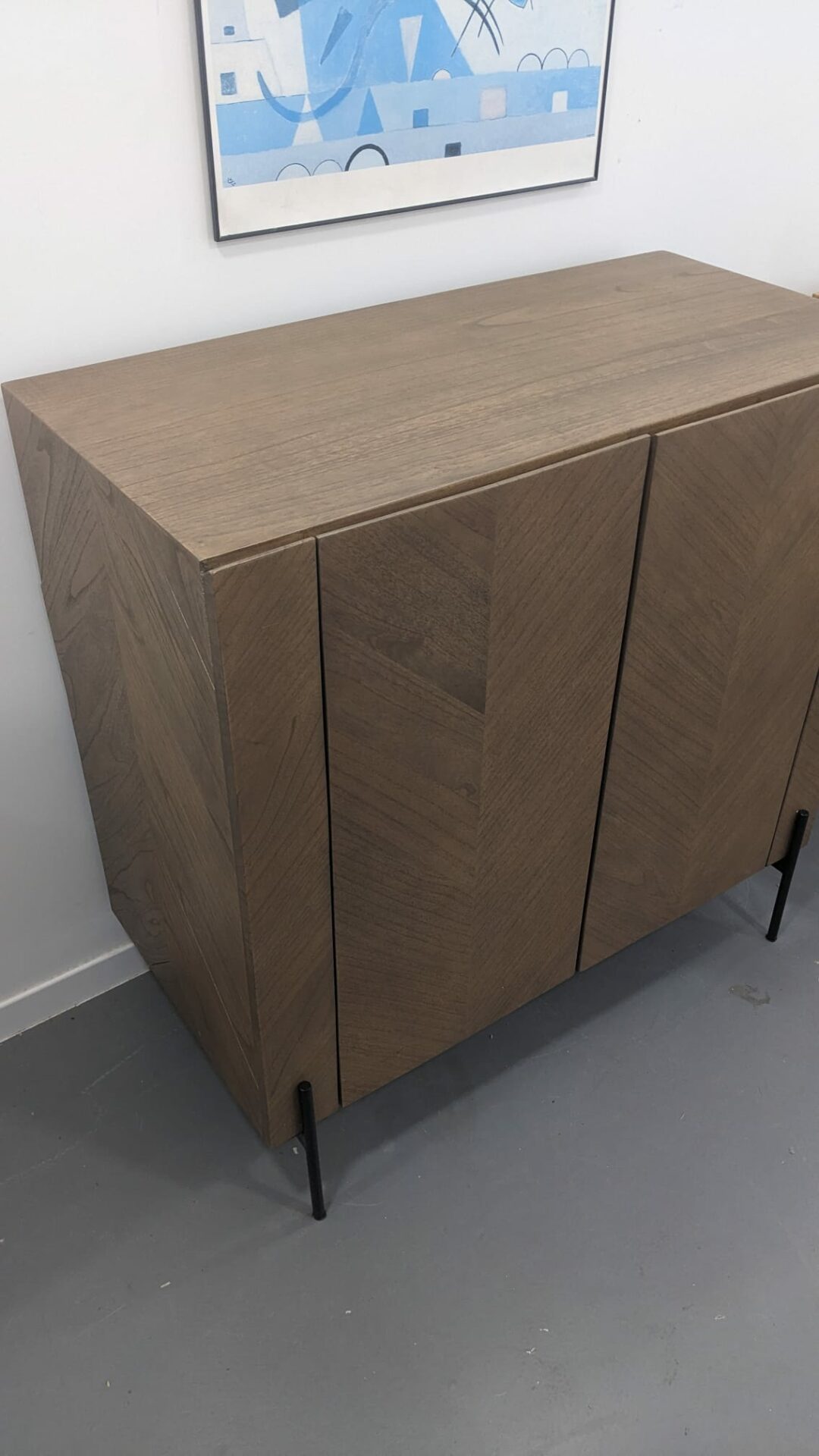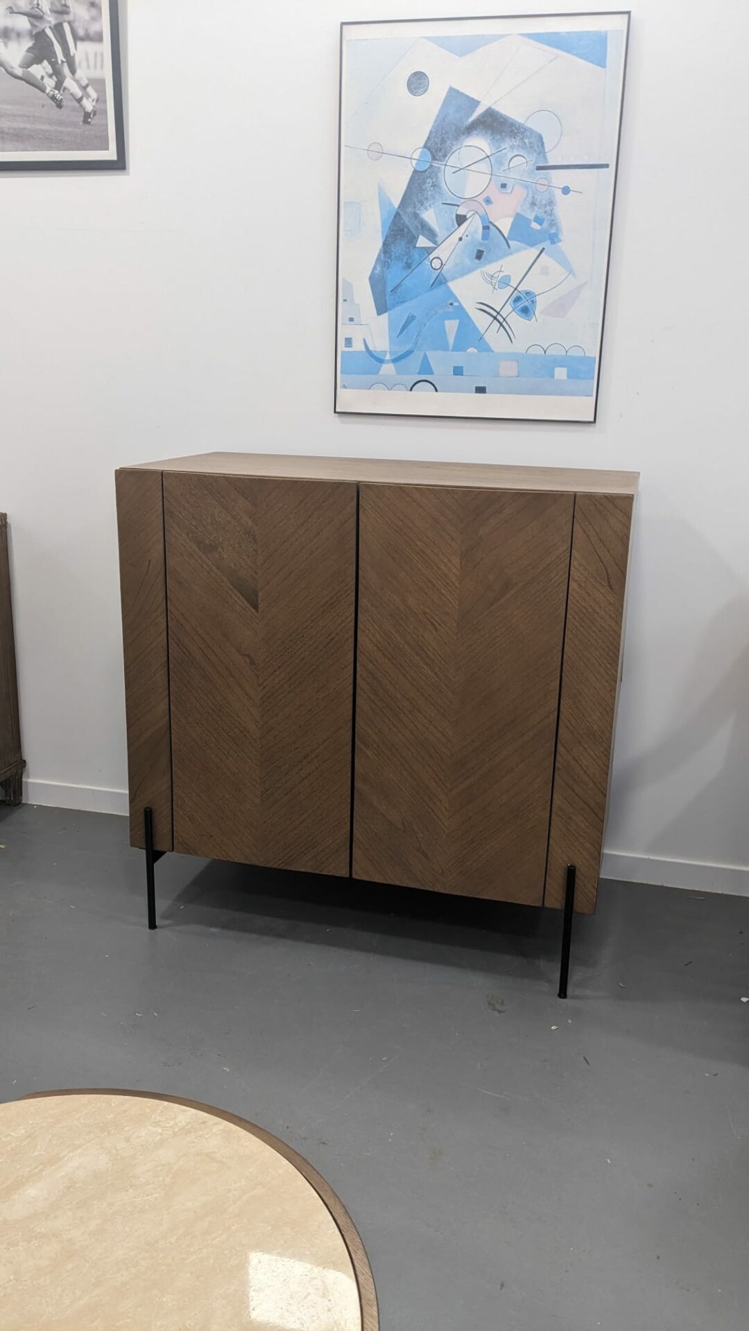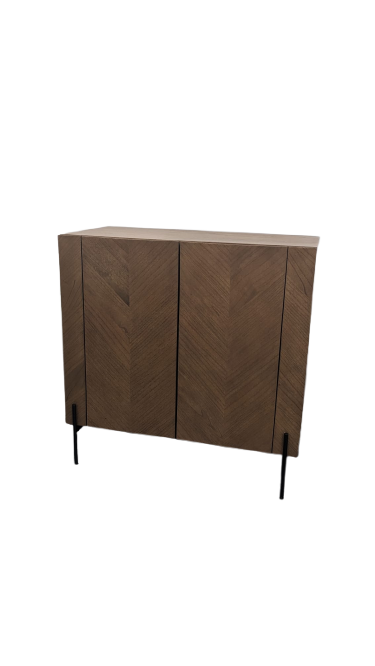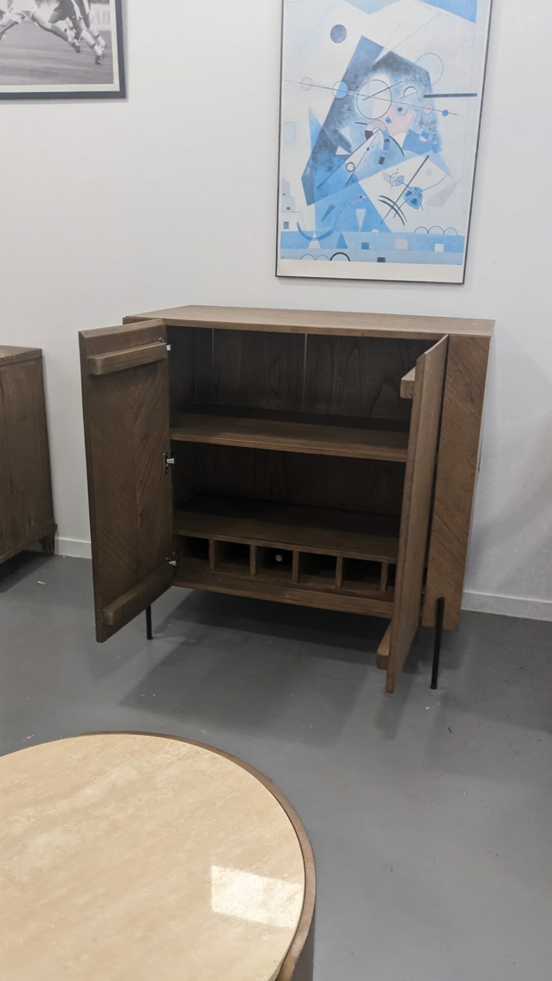 Description : Rangement salle à manger en mindi massif 100 cm. Les motifs chevrons distinctifs sur les deux portes apportent une touche d’élégance, tandis que l’intérieur révèle tout ce dont vous avez besoin pour un moment convivial : deux étagères pour vos verres et accessoires et un rangement à bouteilles astucieux pour garder vos vins préférés à portée de main.