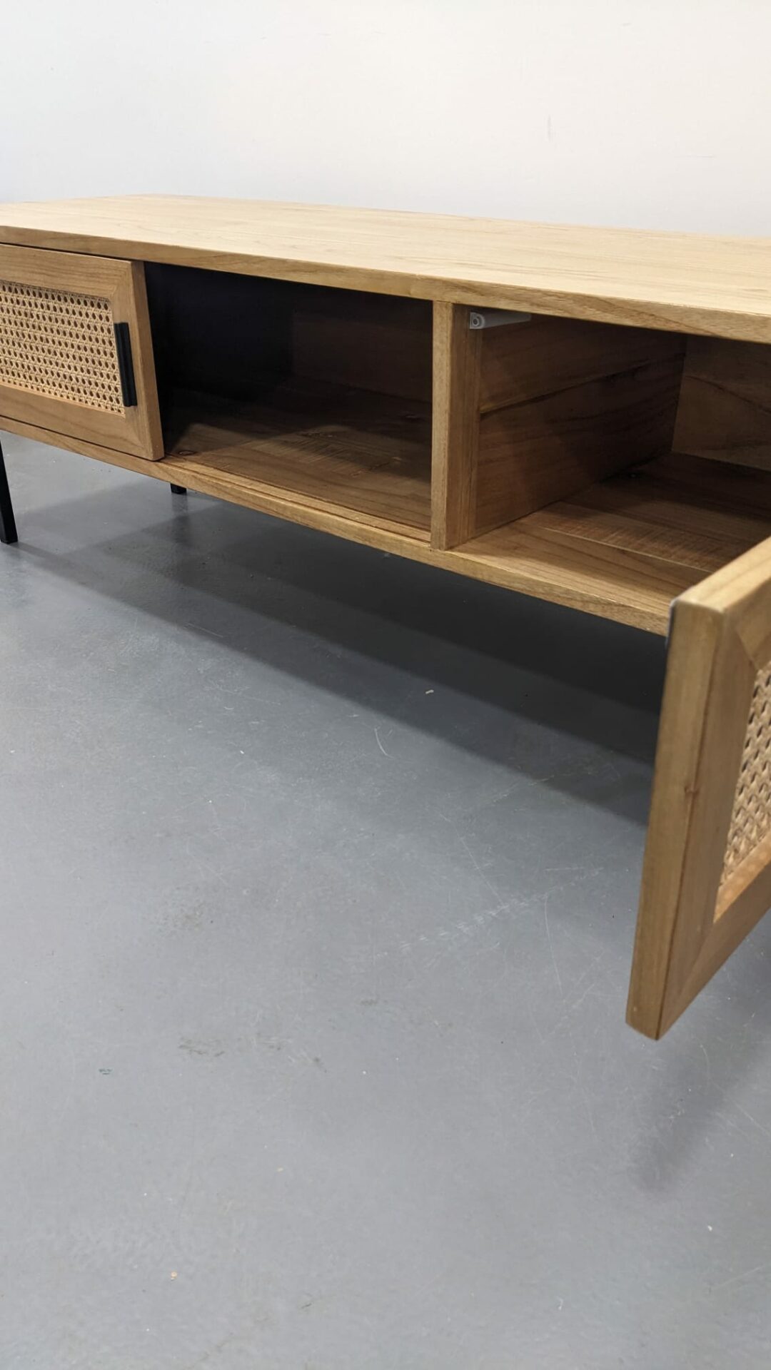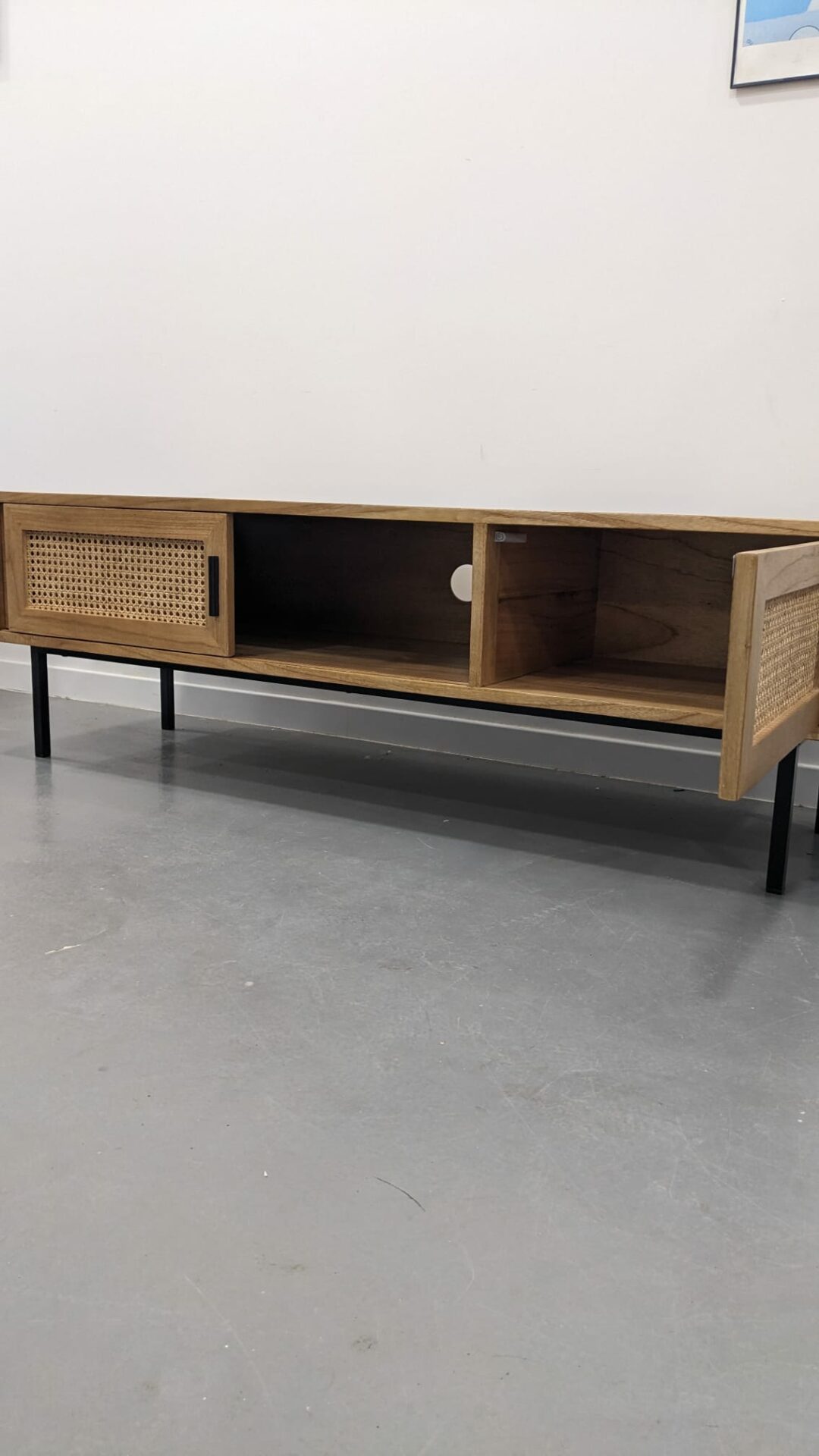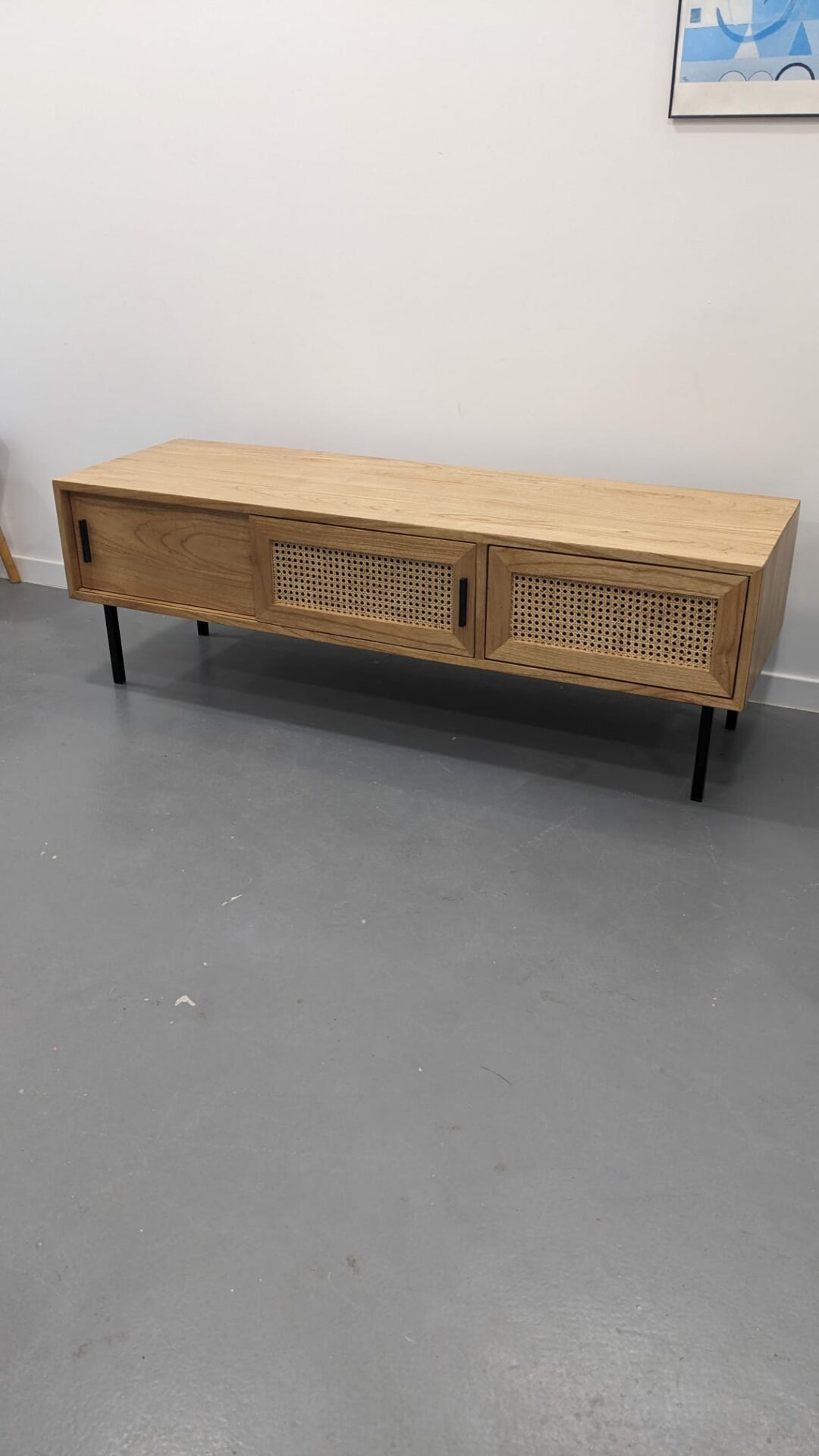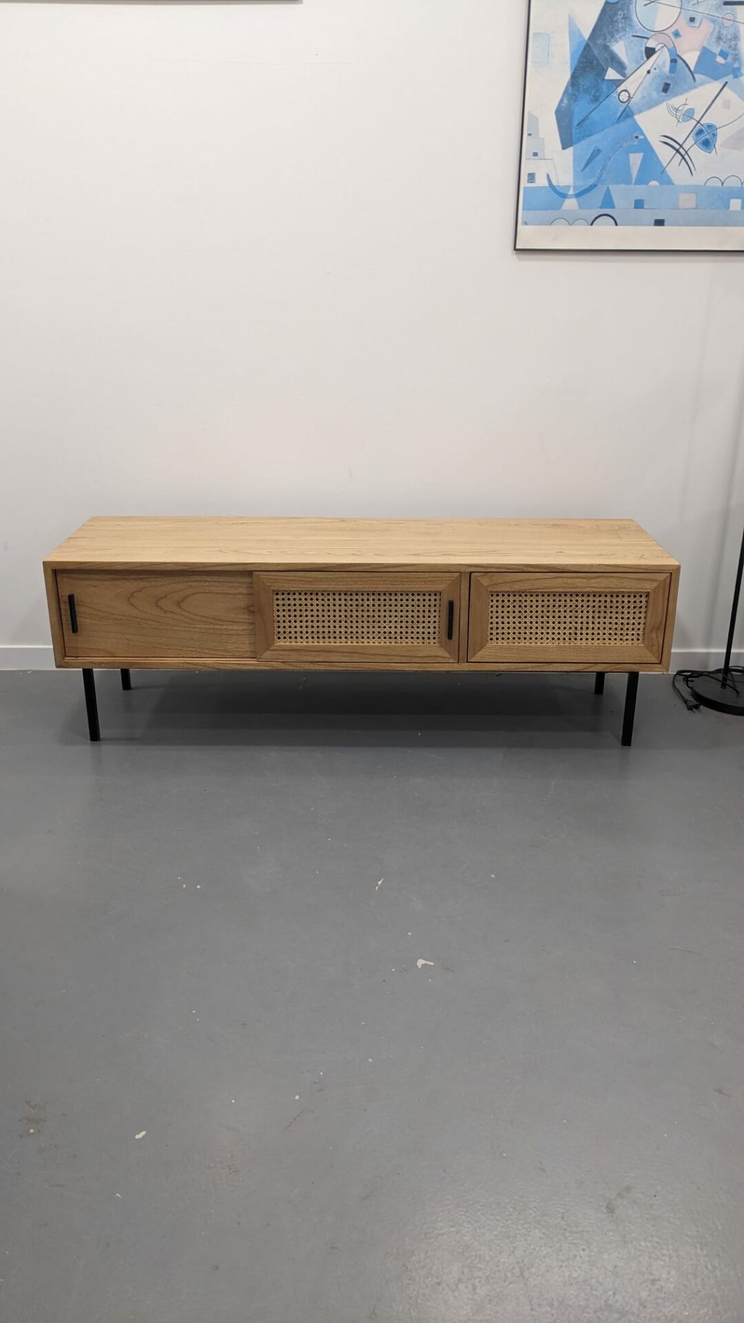 Description : Le meuble TV en bois de mindy et cannage 140 AUBIN est une pièce phare et ajoutera un aspect atypique et original ainsi qu’un style totalement tendance à votre intérieur.