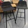 Description : 2 Chaises hautes en fer et résine tressée. Une barre initialement manquante a été remplacée par une barre en bois (chaise pleinement solide et opérationnelle).