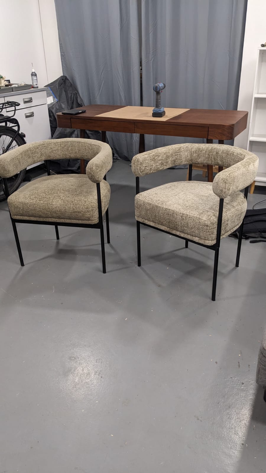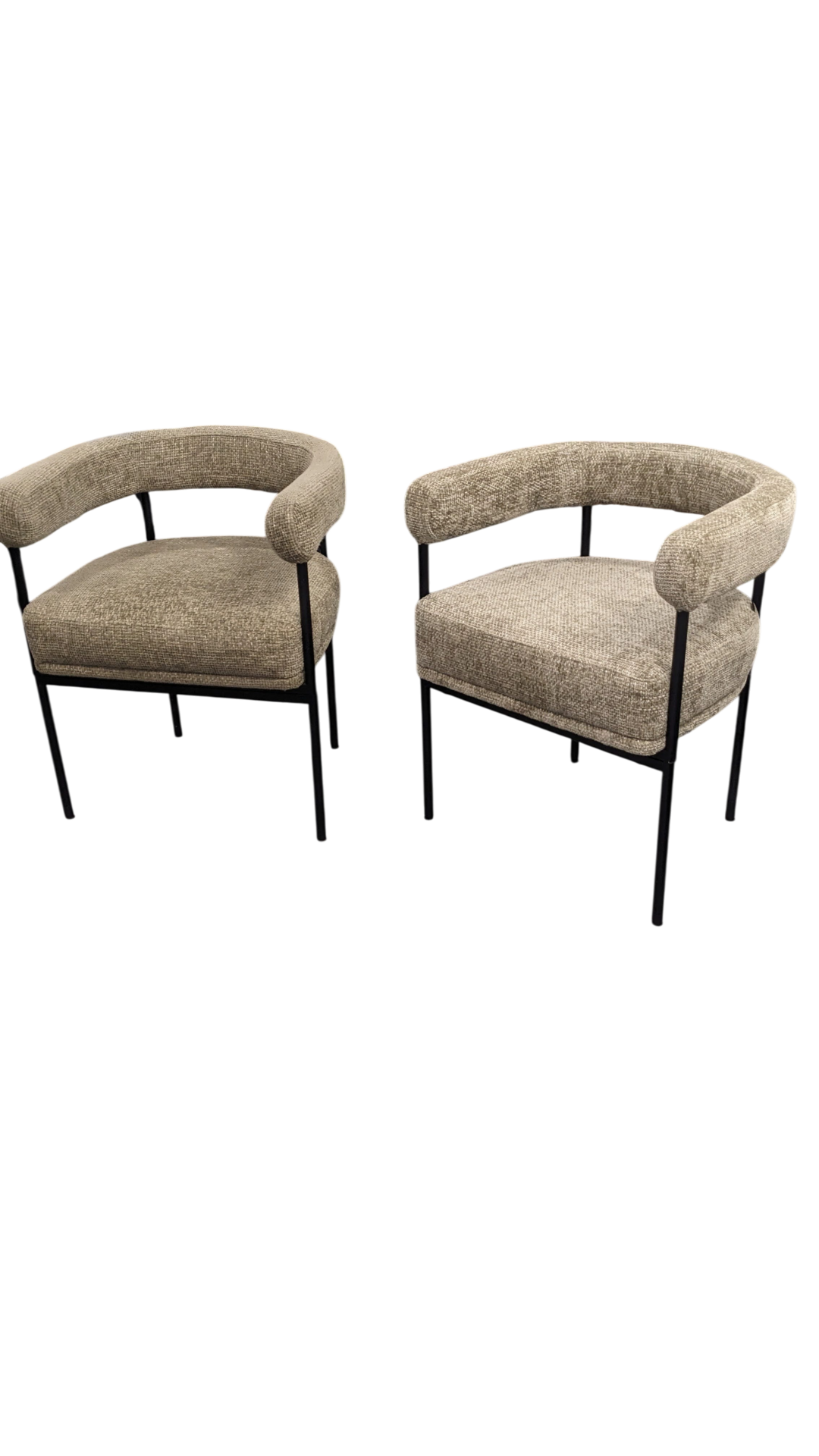 Description :paire de Chaise / fauteuil en tweed taupe ARCADE. Etat : Neuf, jamais servi. le pied souffrait d’un léger défaut qui a été réparé.