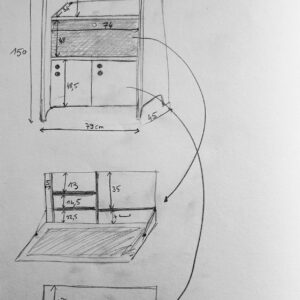 Description : Petit bureau de style rustique avec grand tiroir et pieds tournés. Il est en bon état, le plateau a été poncé et reverni, les pieds sont solides, il n’y a pas de vermoulure.