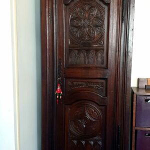 Description : Portes à vitraux garnie de rideaux. Plusieurs tablettes intérieures.