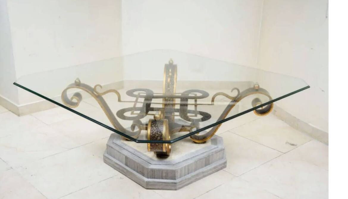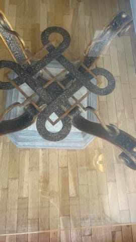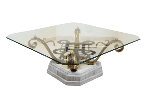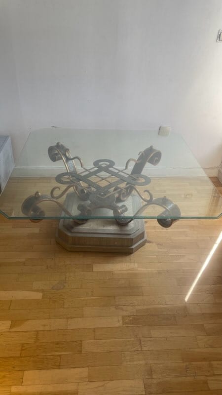 Description : TABLE BASSE avec plateau en verre. Socle en marbre. Ferronnerie support plateau. Plateau de verre securit dimensions 110X110cm. Hauteur 46 cm. Plateau posé sur ventouses facilement détachable.