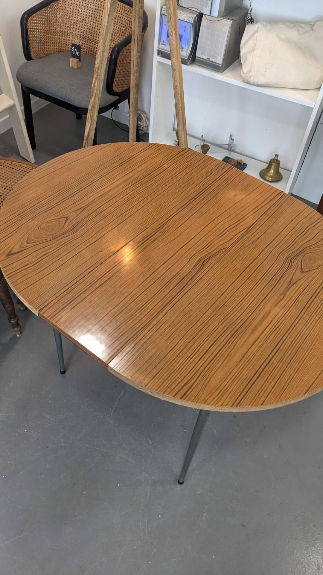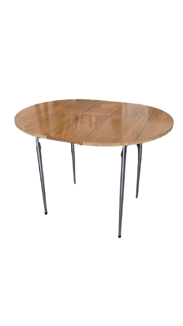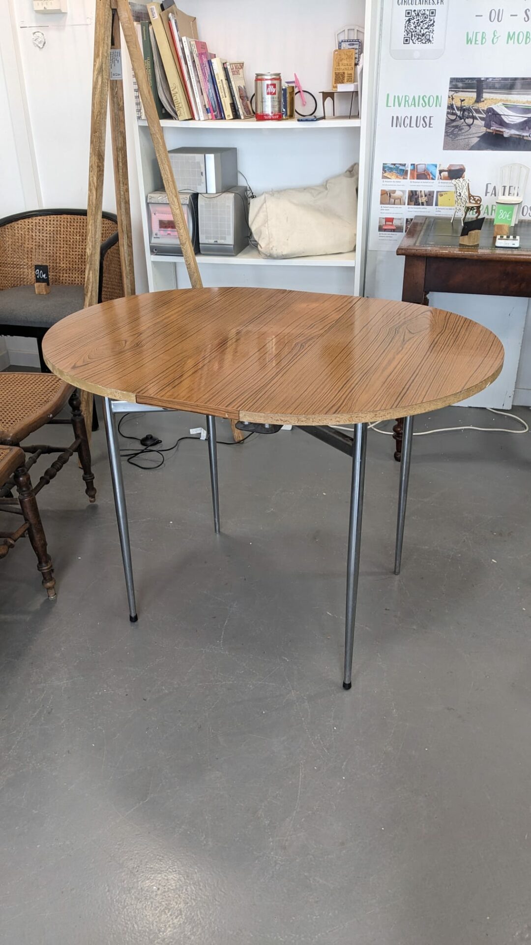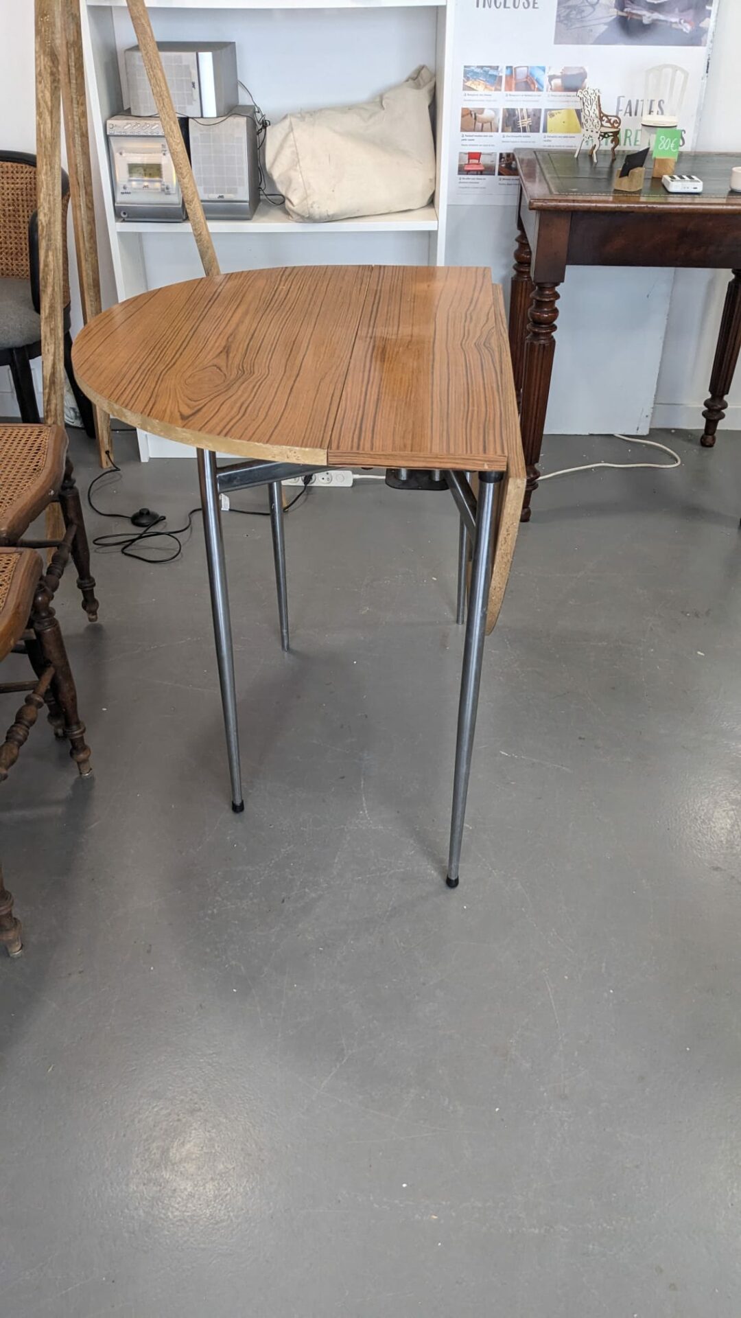 Description : Petite table pliante en formica extrêmement pratique les deux volets se replient ainsi que les pieds qui peuvent être placés sous la console ou sous les volets pour plus de stabilité. Bon état général: quelques marques liées au temps. Structure stable et robuste.