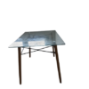 Description : Table de salle à manger en verre avec pieds en bois élancés, design moderne et minimaliste, idéale pour les petites cuisines ou salles à manger.