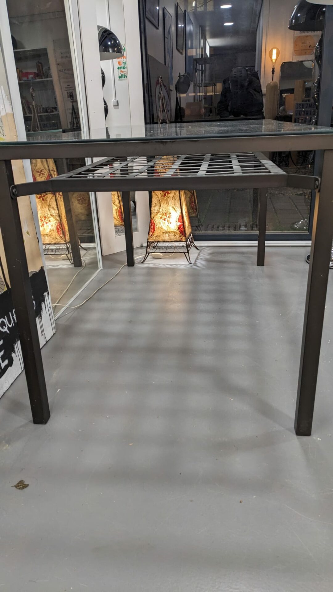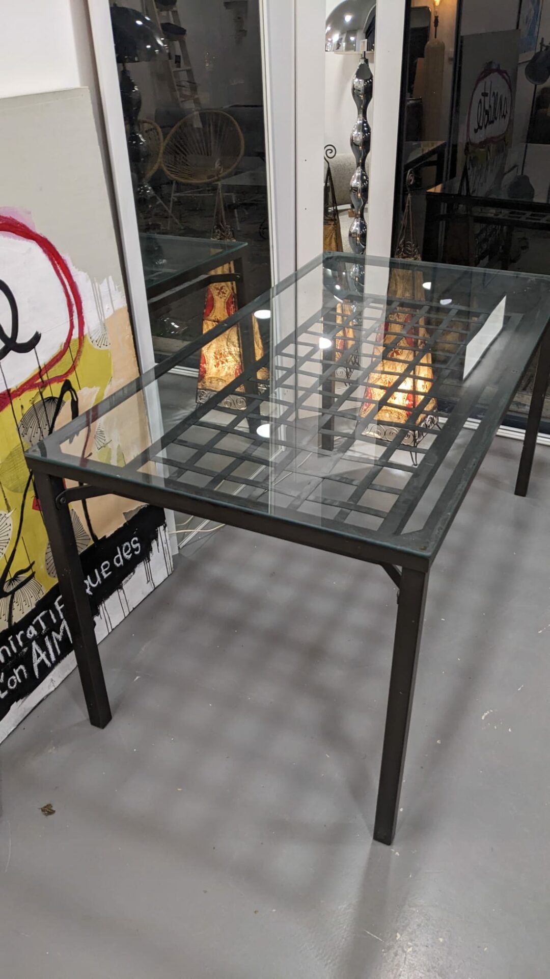 Description : Table ou bureau vintage Ikea des années 90 avec cadre en acier et plateau en verre posé sur le châssis. Un sous-main en acier est disponible sur le plateau pour ranger diverses choses.