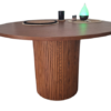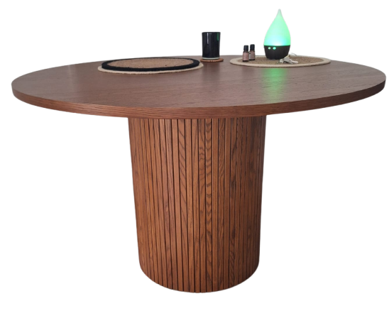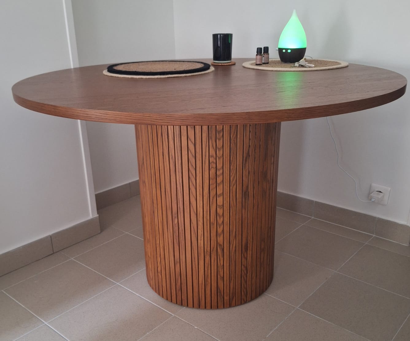 Description : La marque de la table est SORELH, le plateau ERNEST est en MDF avec un revêtement en placage frêne, finition couleur noyer. Pied en chêne massif et placage frêne foncé.