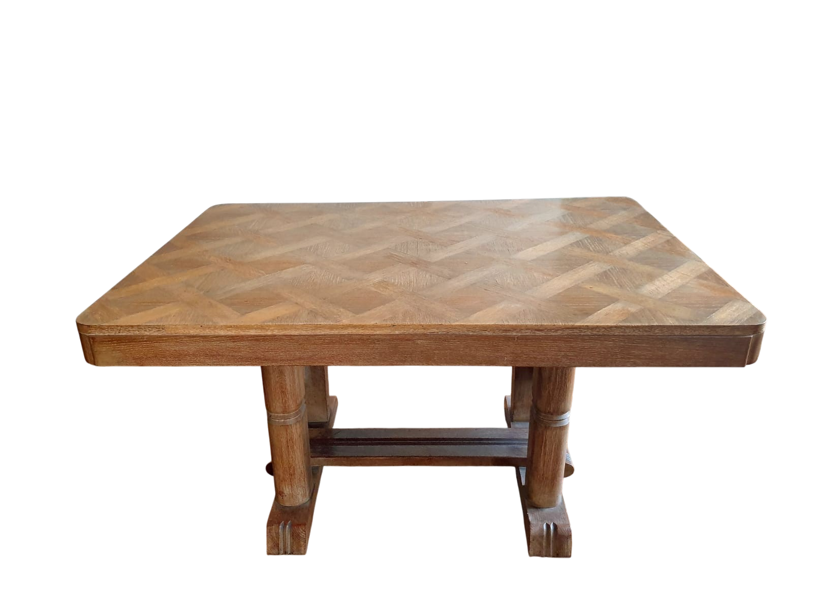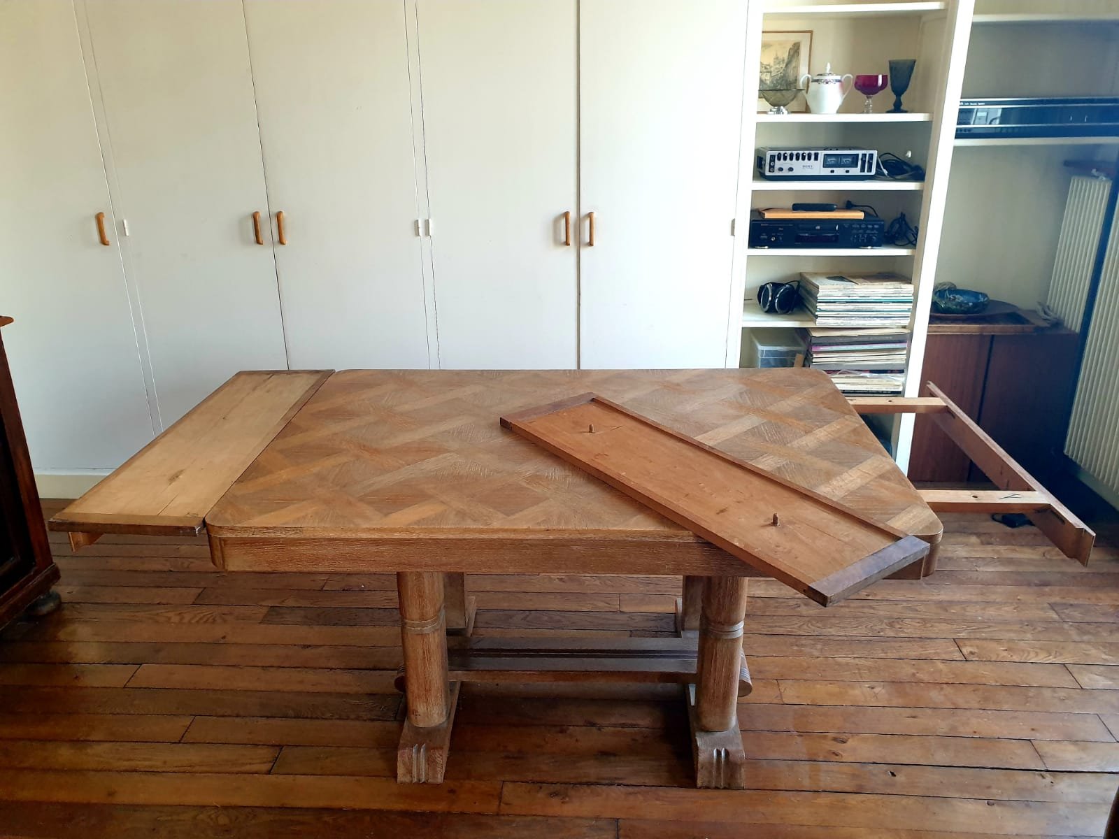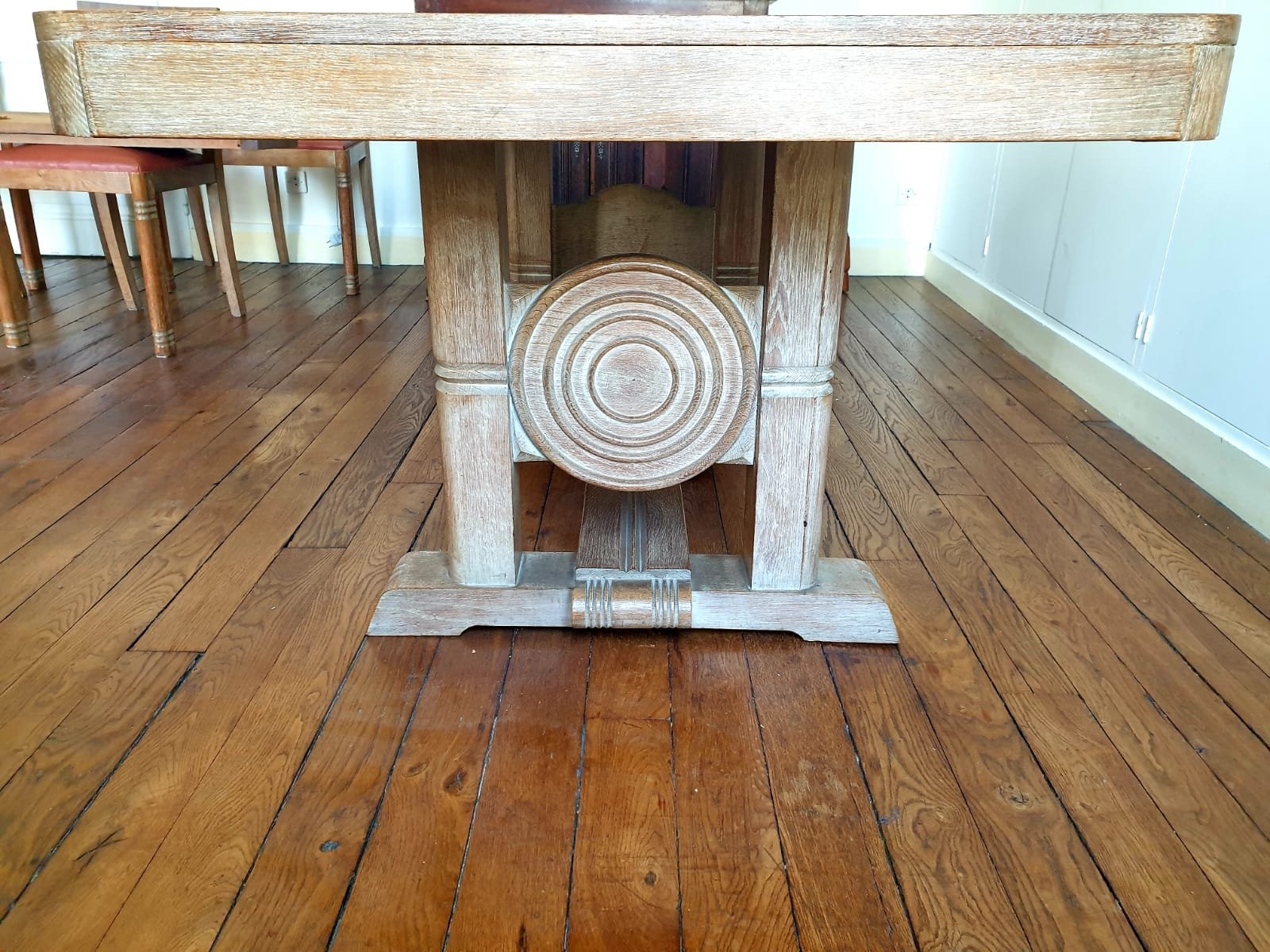Description : Parquetée en chêne et pieds sculptés, années 40. Deux rallonges de 28 cm chacune.