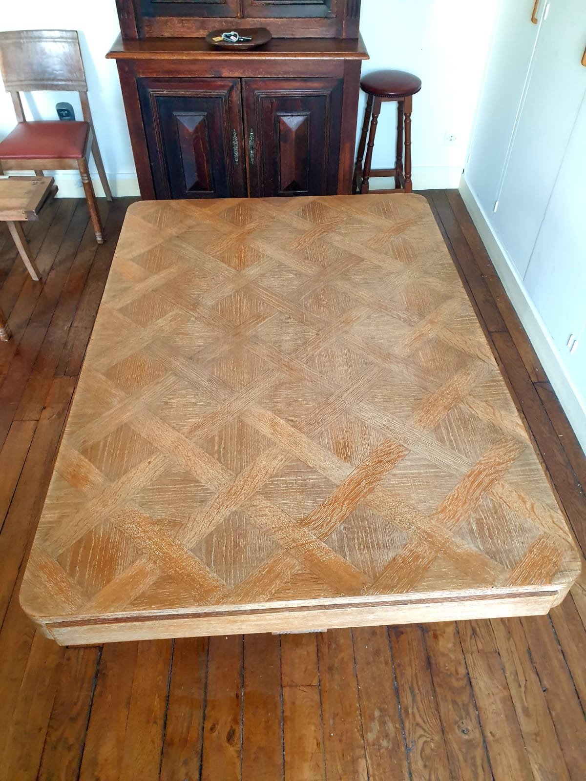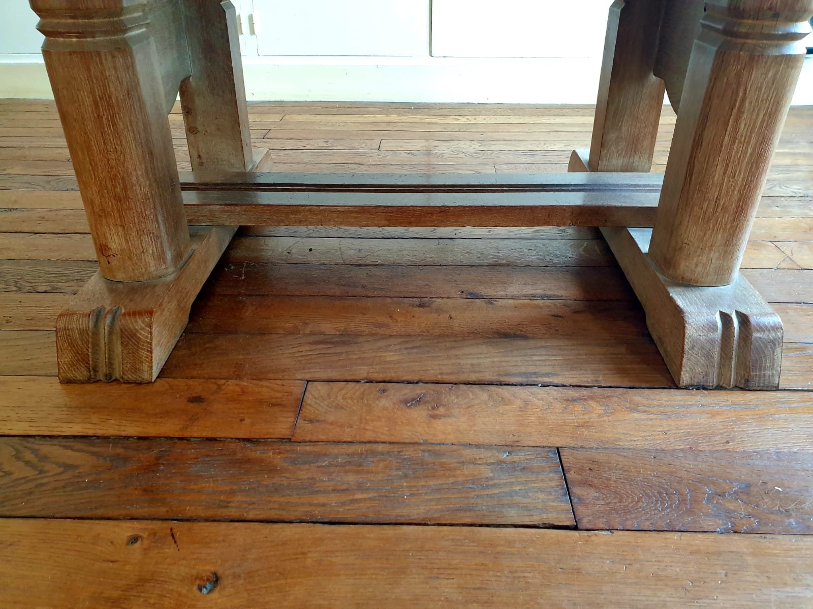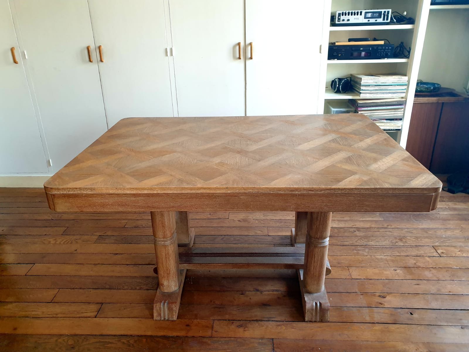 Description : Parquetée en chêne et pieds sculptés, années 40. Deux rallonges de 28 cm chacune.